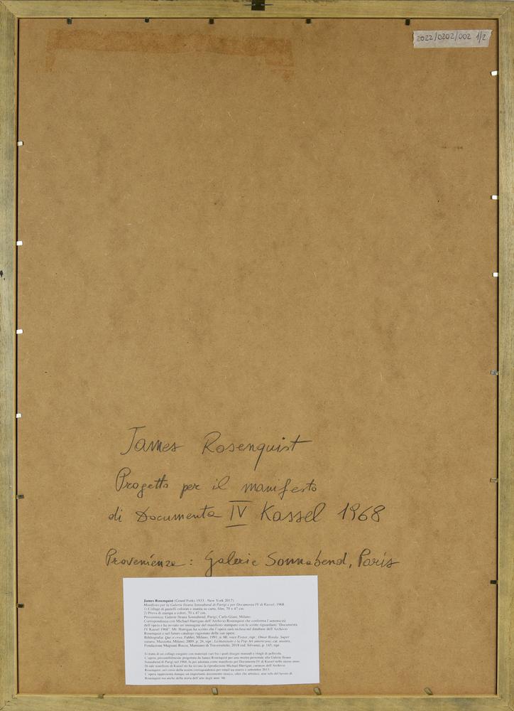 E' presumibile che l'opera di Rosenquist sia nata come layout di un manifesto per una sua mostra personale alla Galerie Sonnabend di Parigi nell'aprile-maggio 1968 (come si legge nella maquette disegnata e colorata a mano dallo stesso artista in basso a sinistra), che ne sia poi stata cambiata la destinazione utilizzandola per il manifesto di Documenta IV a Kassel dello stesso anno (come ha segnalato Michael Harrigan, curatore dell'Archivio Rosenquist, nel corso di una fitta corrispondenza per email tra marzo e settembre 2013).