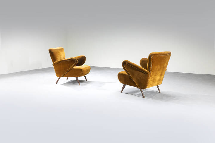 Coppia di poltrone con struttura in legno, rivestimento in tessuto.