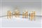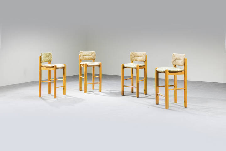Quattro sgabelli con struttura in legno, sedute e schienali in paglia.