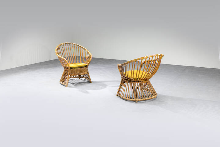 Coppia di poltroncine in vimini, cuscini imbottiti rivestiti in tessuto.