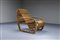 Poltrona a forma geometrica con struttura in bamboo e canna d’india, legature in cuoio intrecciato.