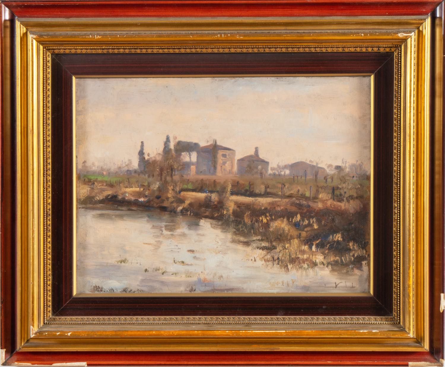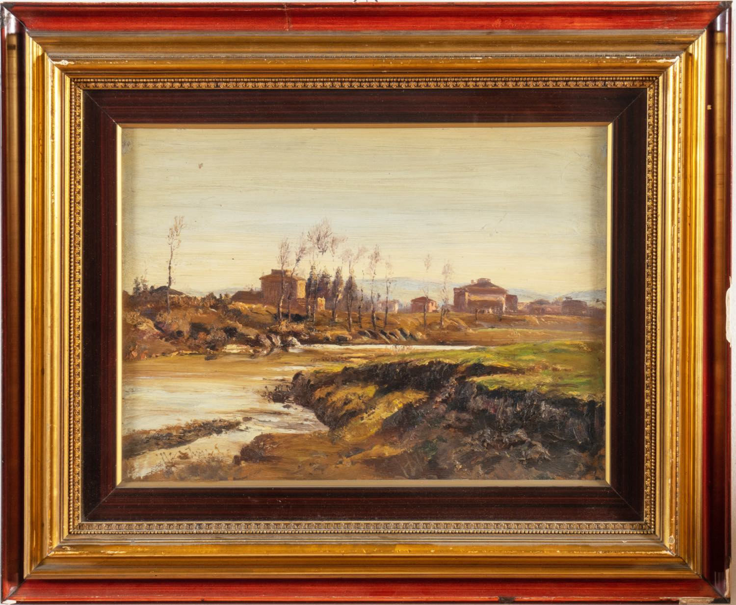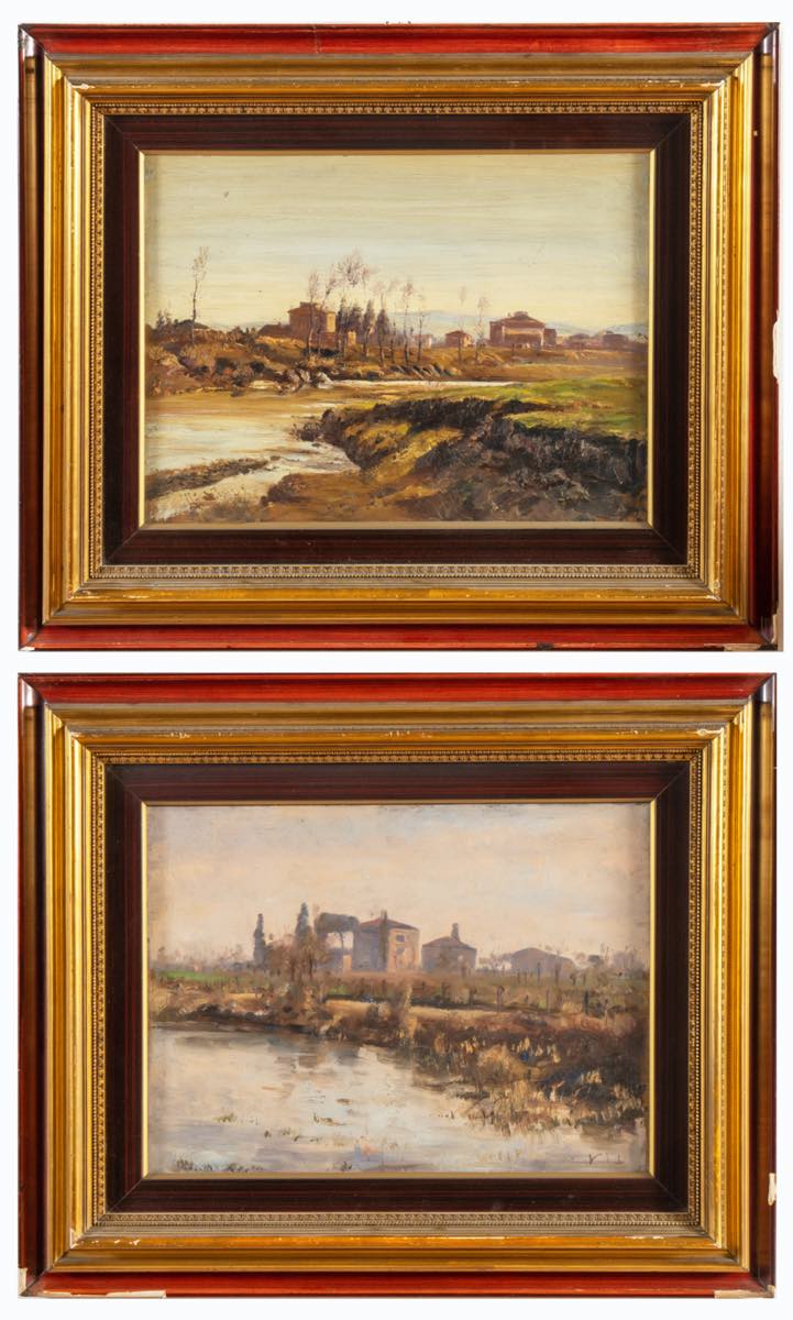 Anonimo del XIX-XX secolo, Coppia di dipinti raffiguranti “Paesaggio”.Olio su tela, H cm 35x47.5 - H cm 49x37
