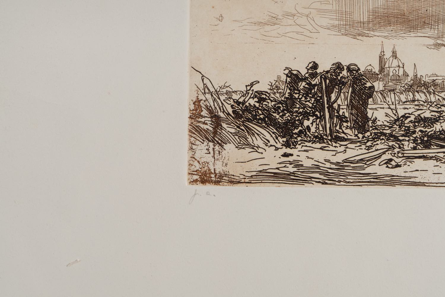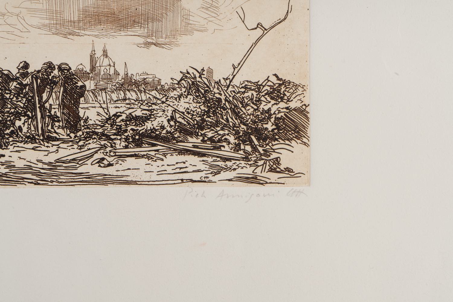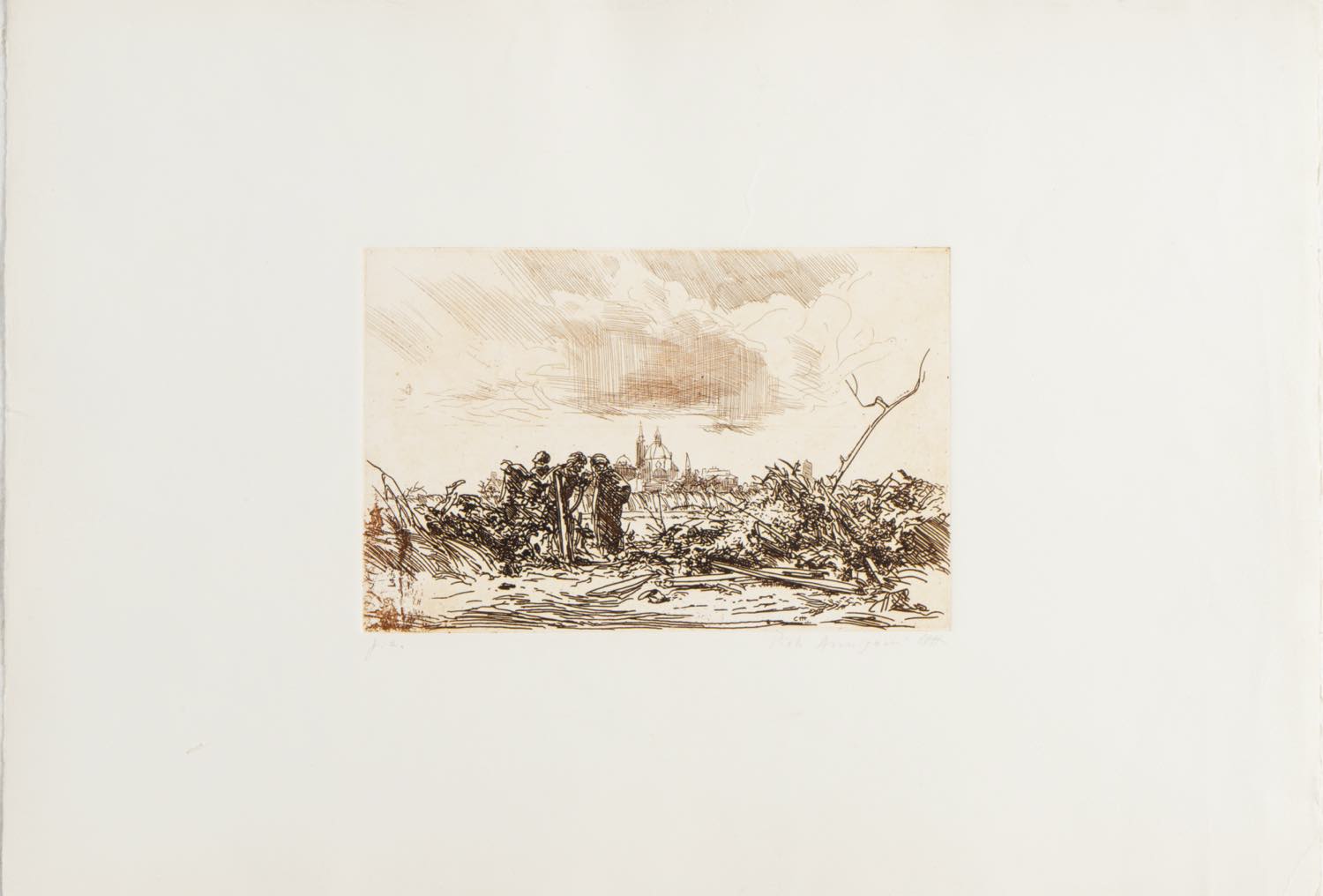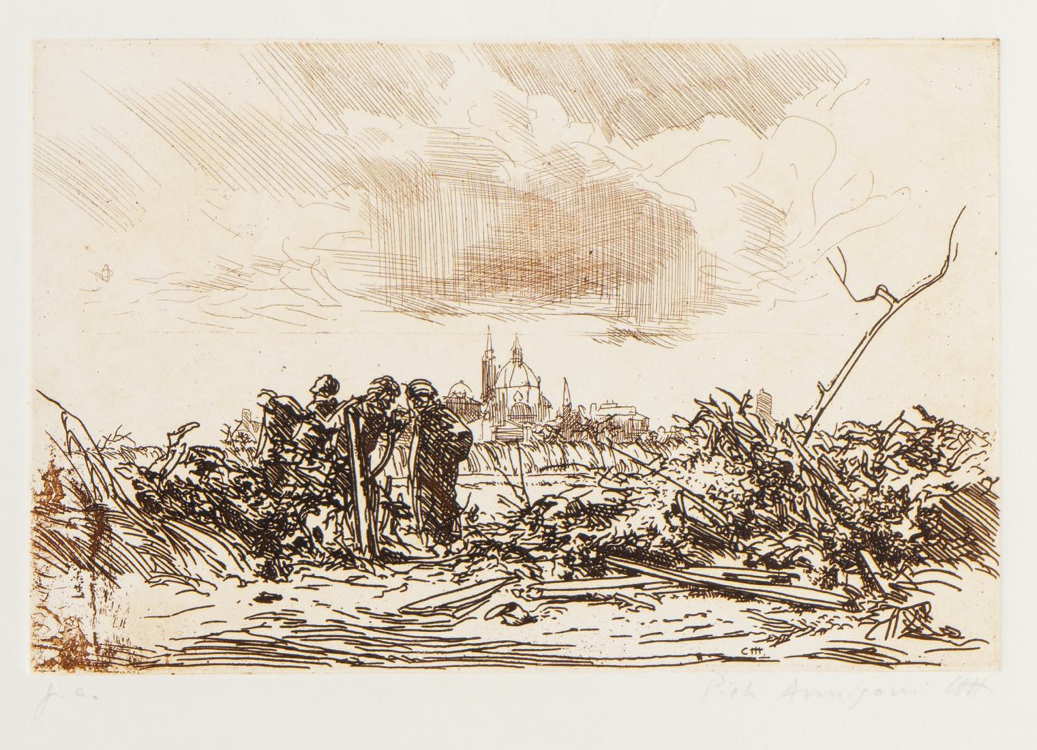 Pietro Annigoni (Milano 1910 - Firenze 1988), “Paesaggio con figure”, seconda metà del XX secolo.Acquaforte su carta, firmata e siglata in basso a destra, esemplare in basso a sinistra “p.a.”, Foglio H cm 35x50