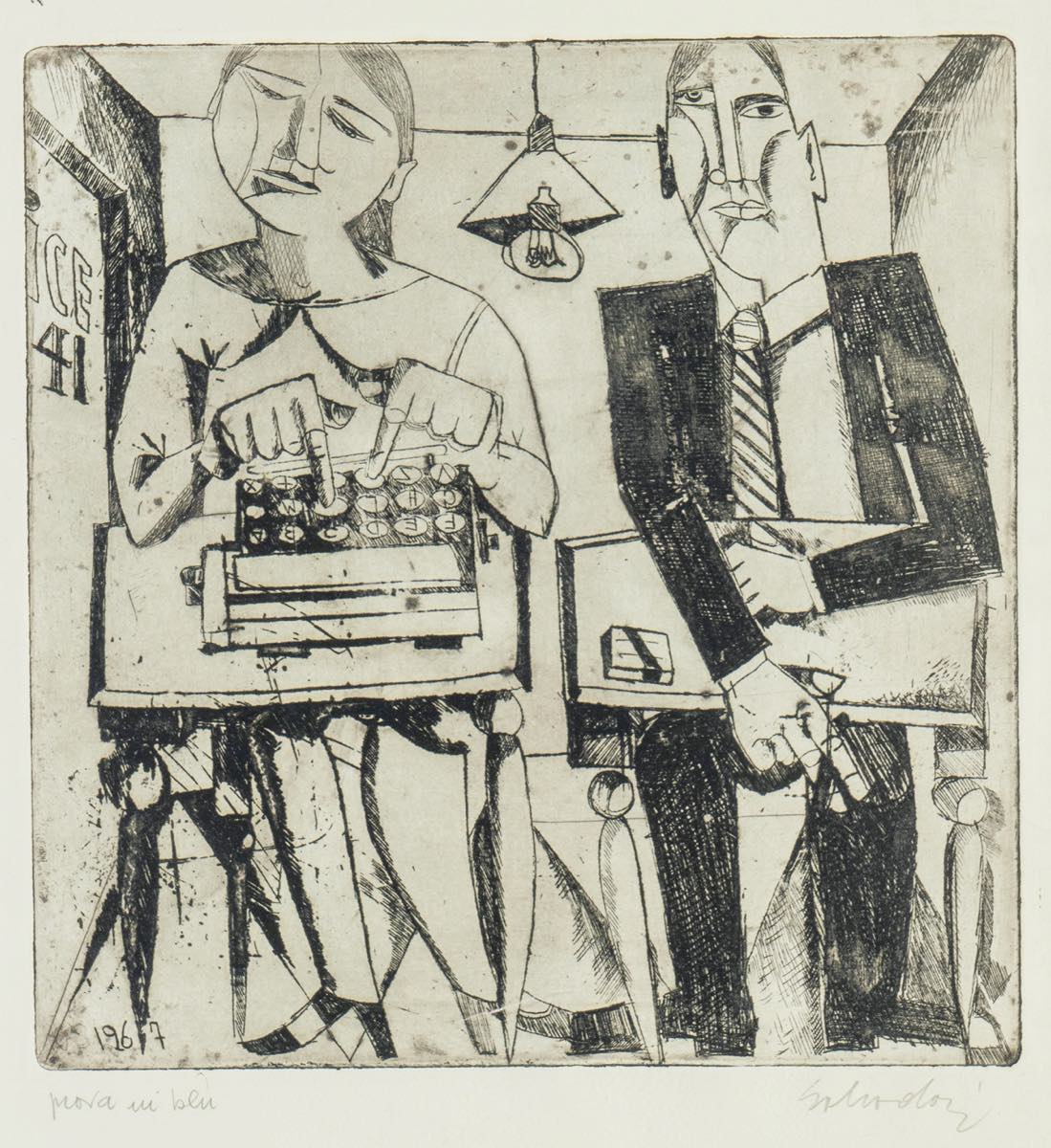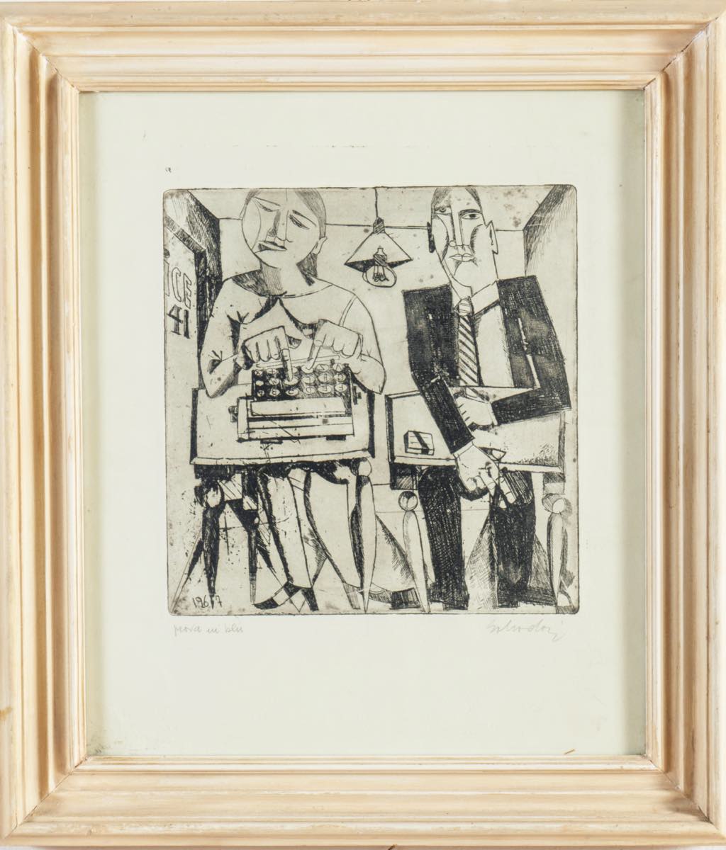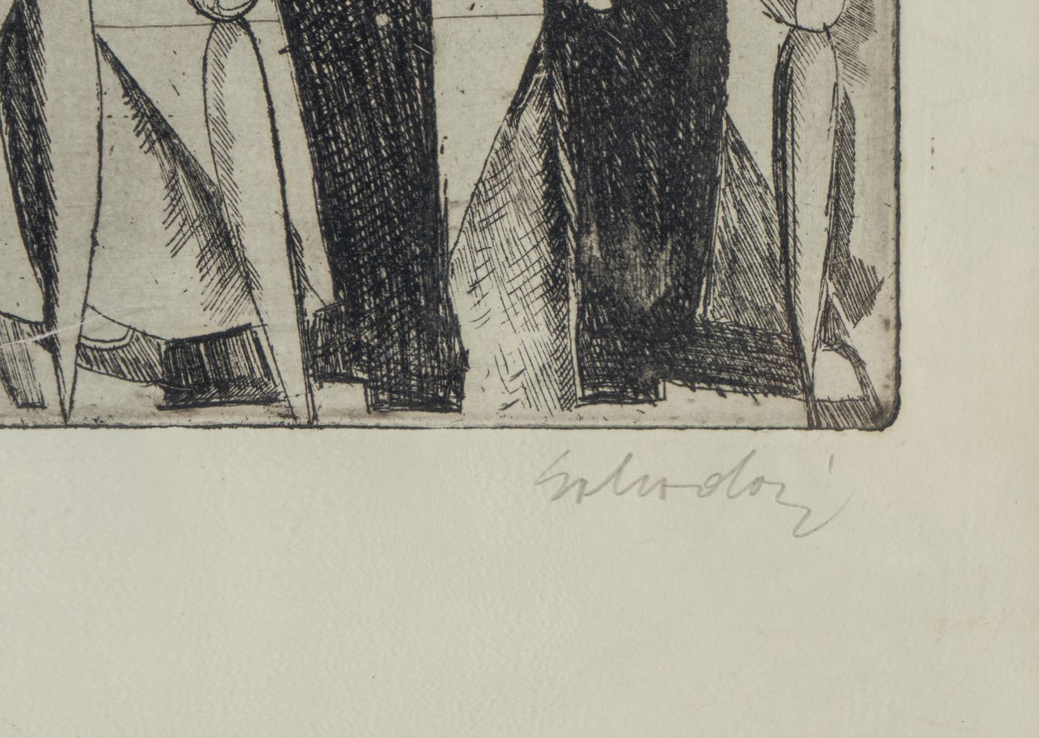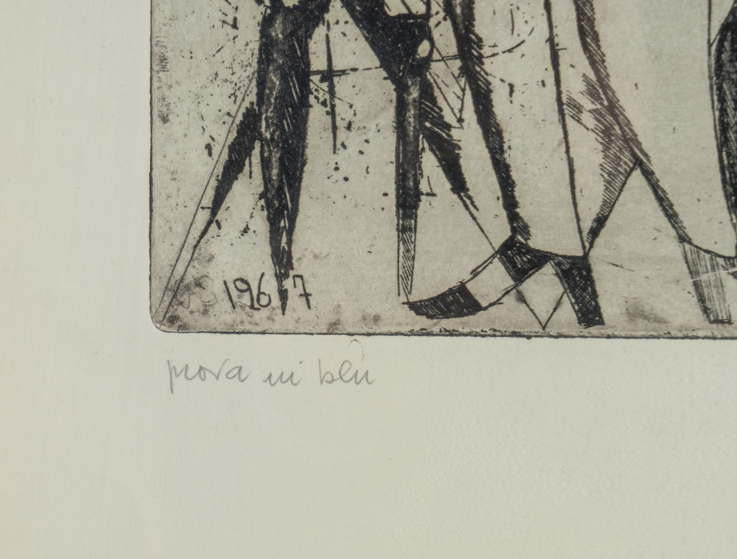 Aldo Salvadori (Milano 1905 - Bergamo 2002), “Figure”, 1967.Acquaforte su carta, datata in basso a sinistra sulla lastra, firmata in matita in basso a destra, esemplare in matita in basso a sinistra “prova in blu”, Lastra H cm 25x24
