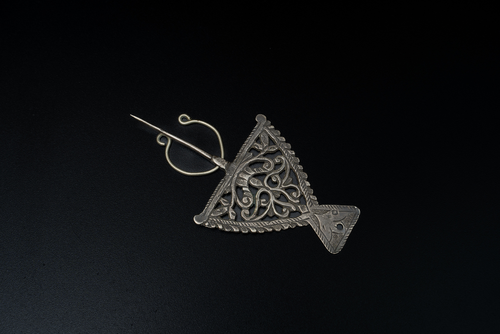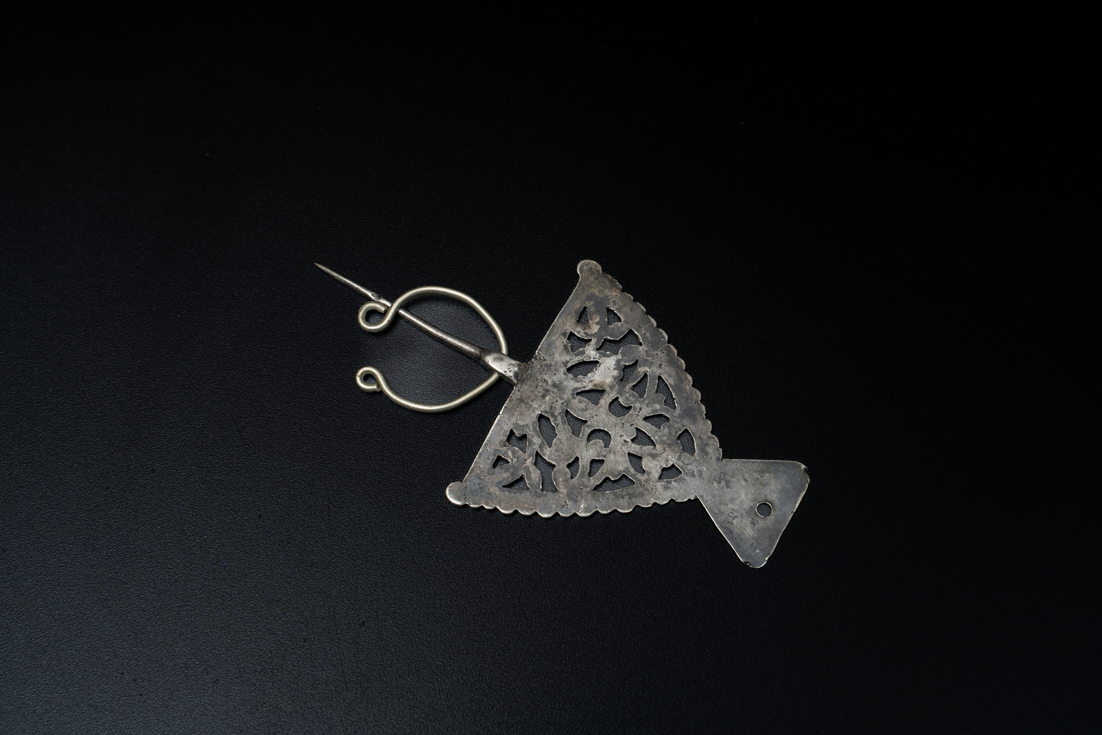 Argento. . . Cm 6,00 x 11,50 x 5,00. Bella ed antica fibula traforata ed incisa al fronte a motivi floreali stilizzati.