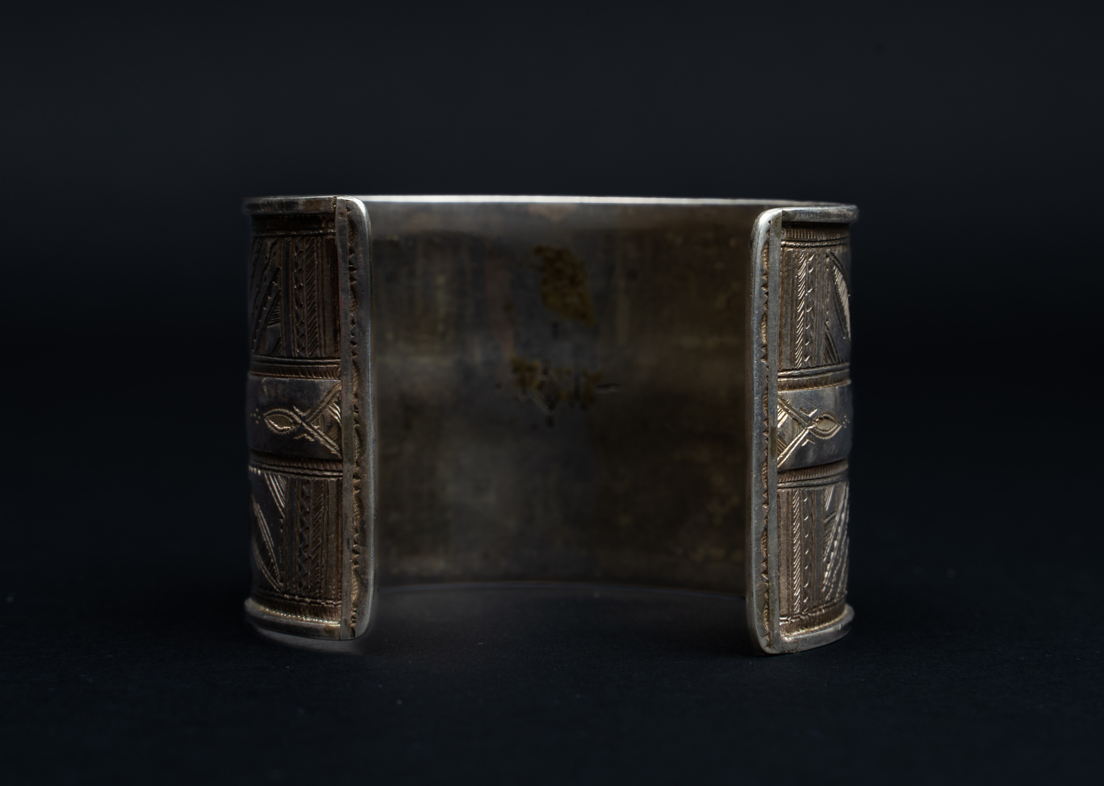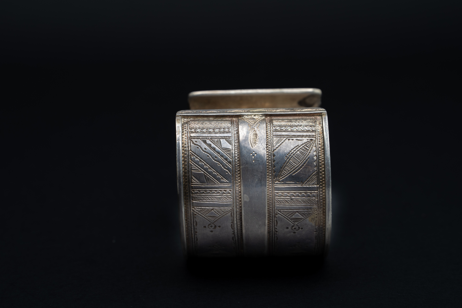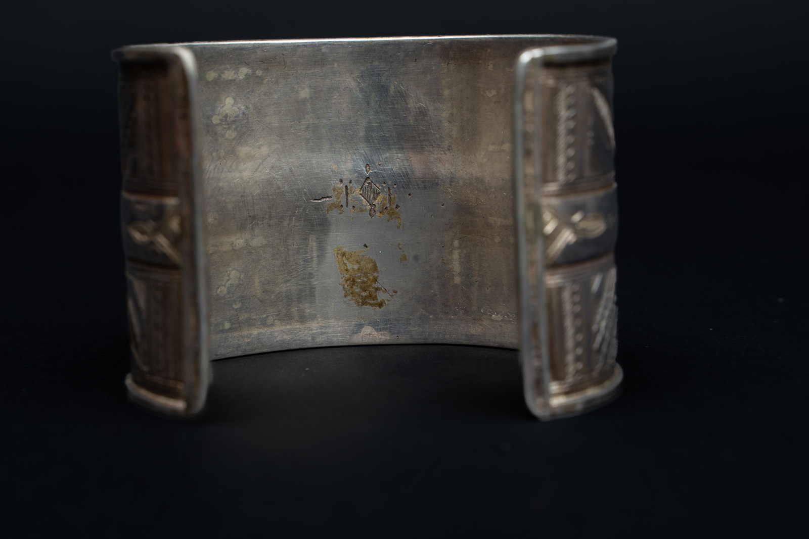 . . Cm 6,80 x 4,70 x 5,50. Bracciale rigido in argento finemente cesellato con motivi geometrici tipici Tuareg ed in ottimo stato di conservazione. All interno reca inciso in Tifinagh, la scrittura dei Tuareg, una firma o i marchi del titolo dell'argento.