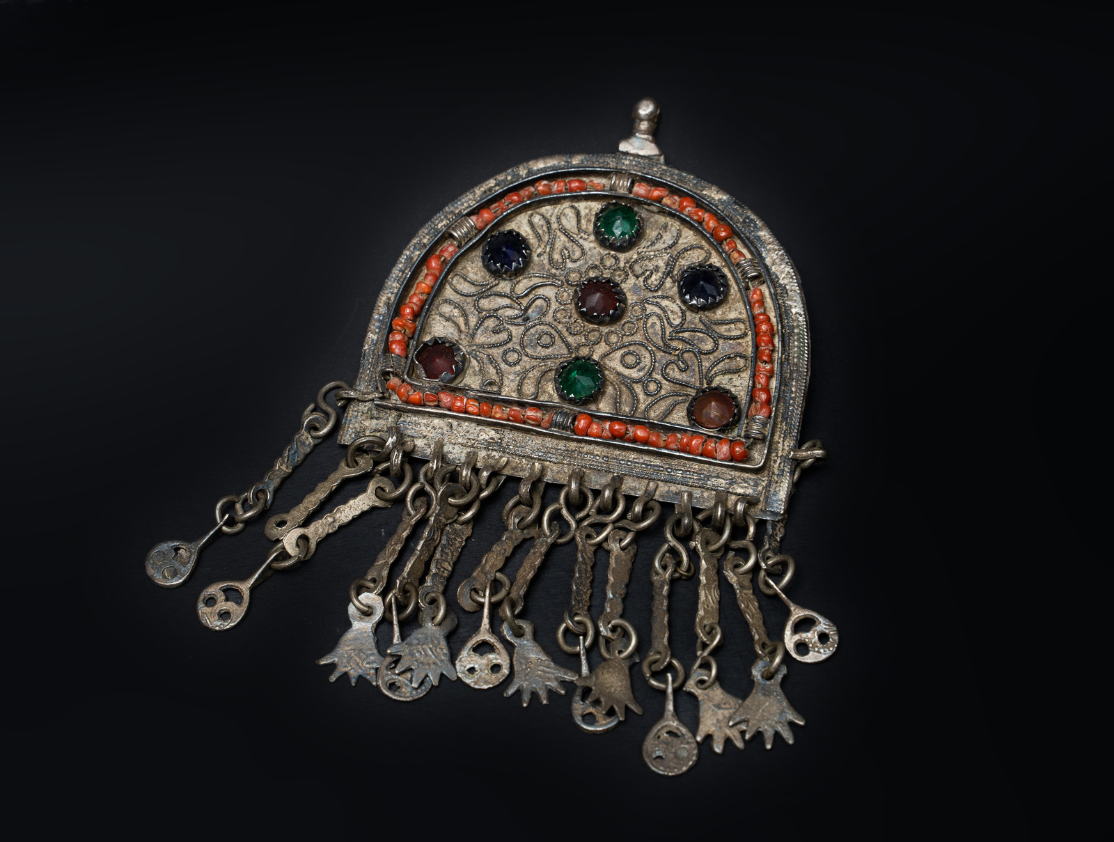 Arte africana - Tunisia. Pendente con ciondoli, coralli e paste vitree caratterizzato da diverse mani di Fatima. Argento con punzoni islamici. .