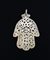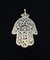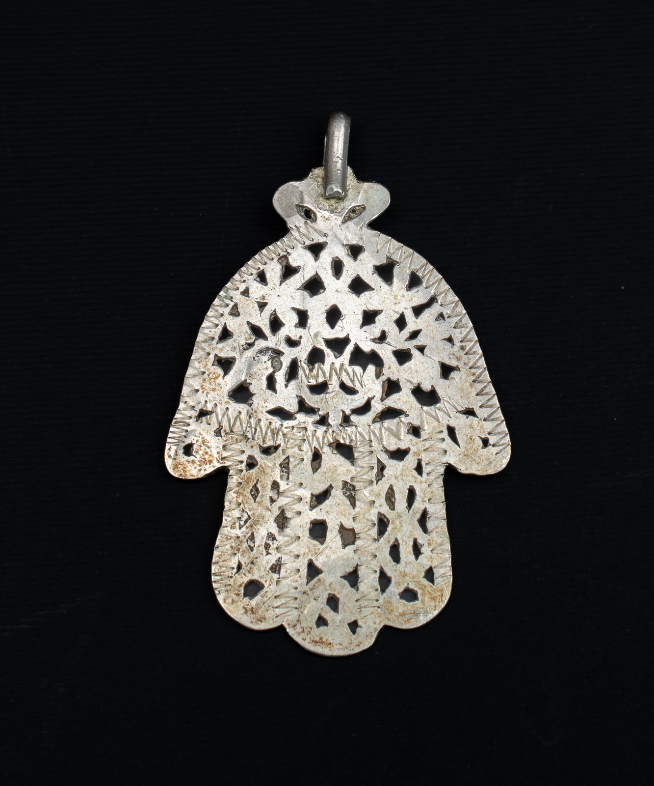 Argento. . Cm 4,80 x 7,50. Usurata mano di Fatima incisa e traforata a motivi geometrici e floreali.