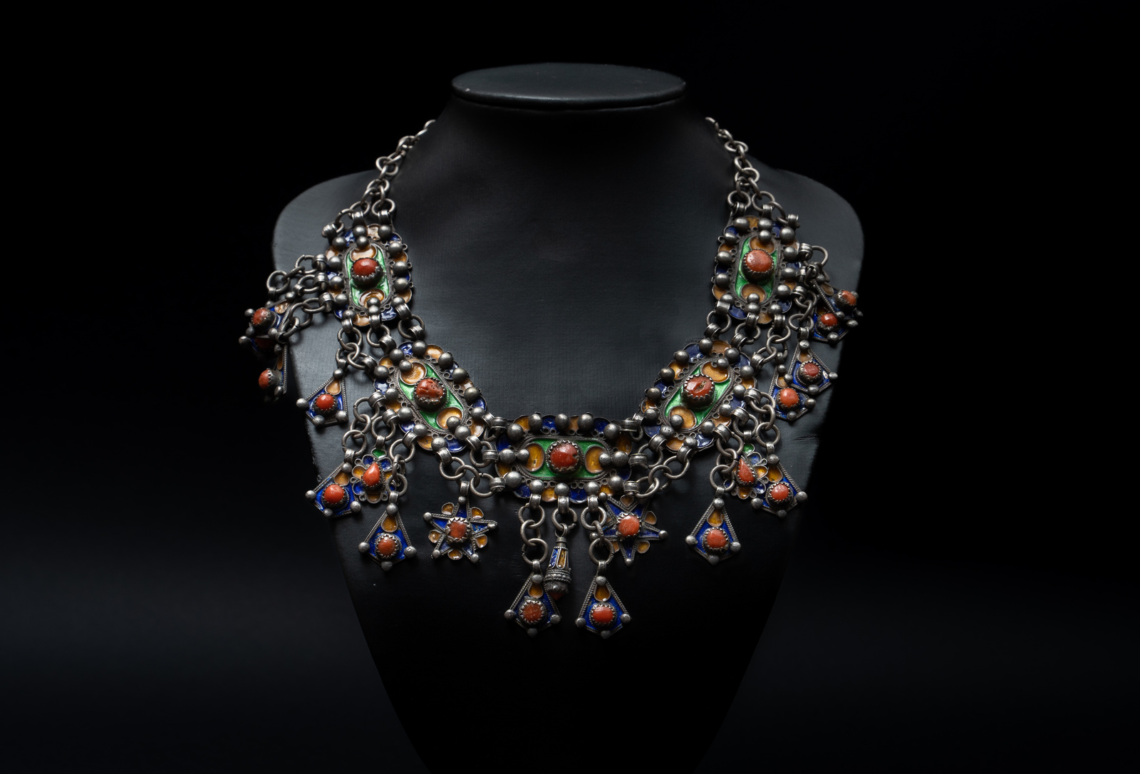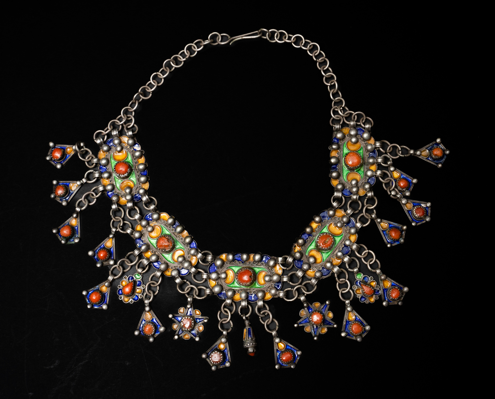 . . Cm 70,00 x 45,00 x 0,80. Bella e variopinta collana algerina, rappresentativa della gioielleria berbera, originariamente utilizzata durante i matrimoni e per cerimonie. In ottimo stato di conservazione.