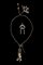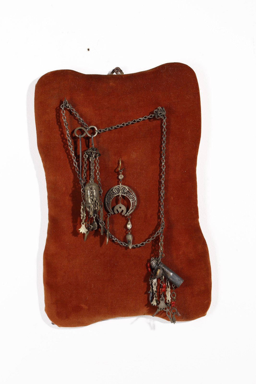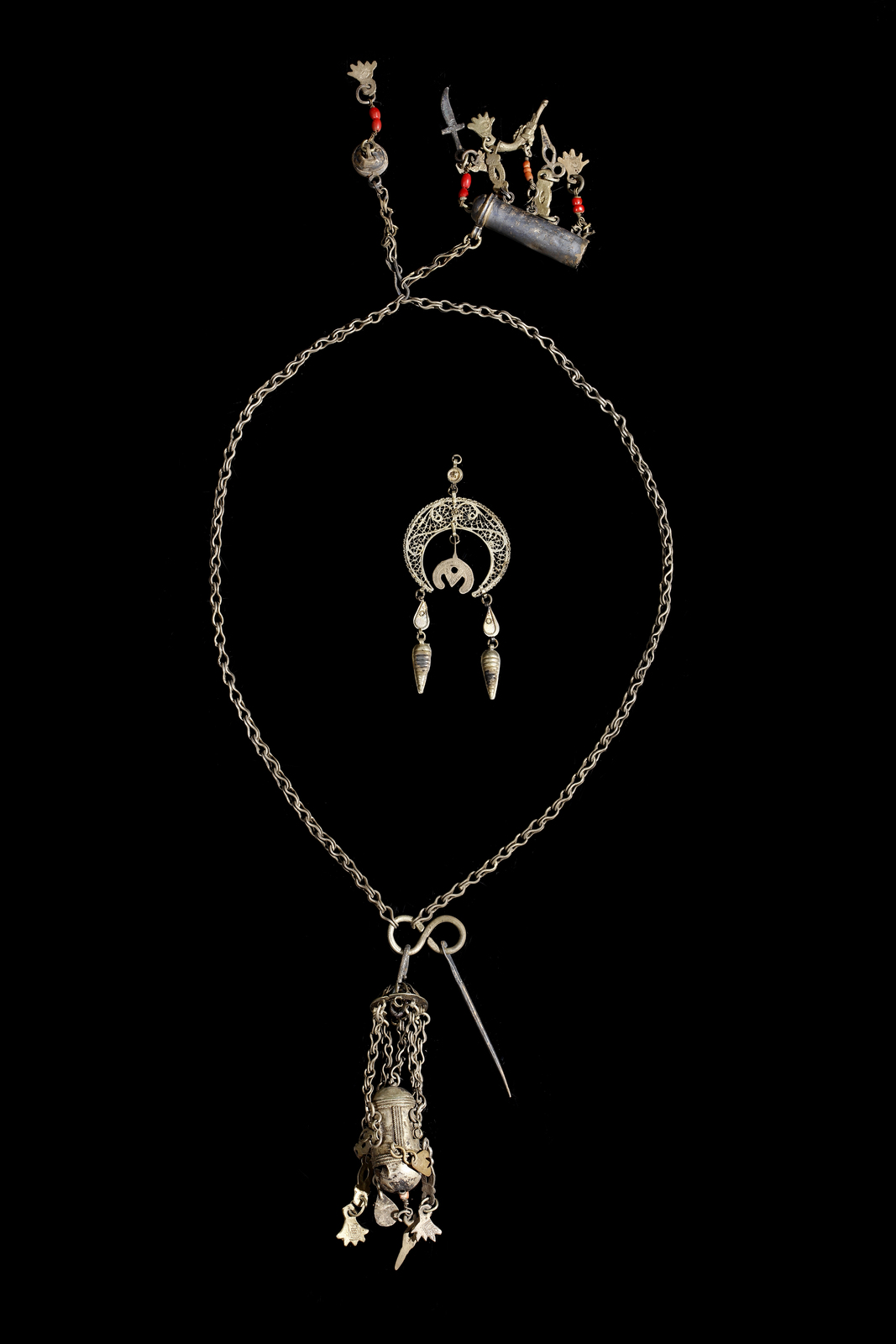 Lega d'argento e corallo. . . Lotto composto da un orecchino in filigrana a motivi islamici e da una collana nord africana, probabilmente Berbera, corredata da diversi pendenti di foggia islamica affiancati ad altri, deliziosi, di ispirazione europea come le forbici, il coltello e persino una pistola revolver,
