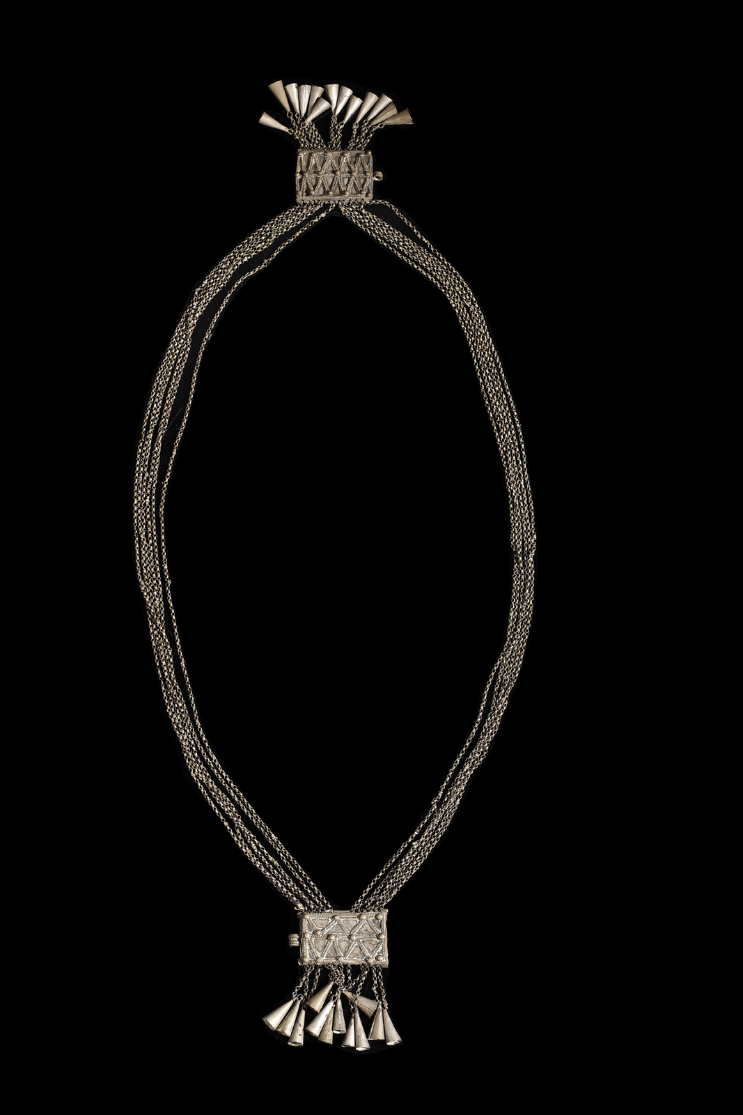 Lega d'argento. . . Particolare collana a sei fili di catenelle con pendente e dorsale che ricordano i tcherot portati dai nomadi del Sahara, talismani destinati a proteggere i proprietari dagli spiriti maligni. In questo caso i pendenti sono decorati con motivi geometrici simmetrici ed asimmetrici e corredati da campanelle a forma conica.
