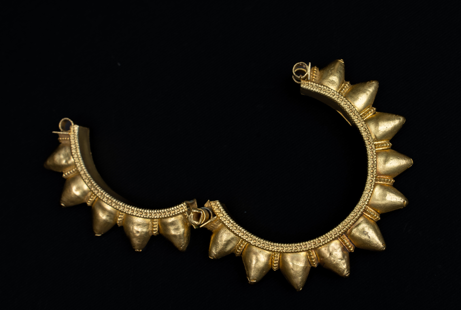 Metallo dorato. . . Cm 8,50 x 8,50 x 1,00. Bracciale a canna vuota in forma e doratura tipica dell'oreficeria Ashanti del Ghana, non a caso una volta chiamata costa dell'oro.