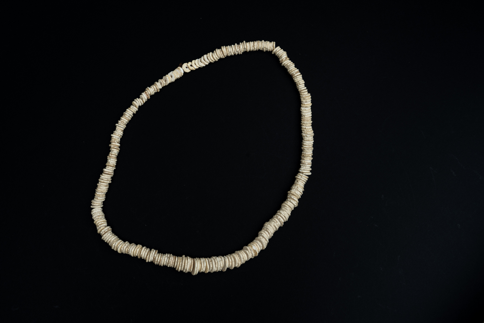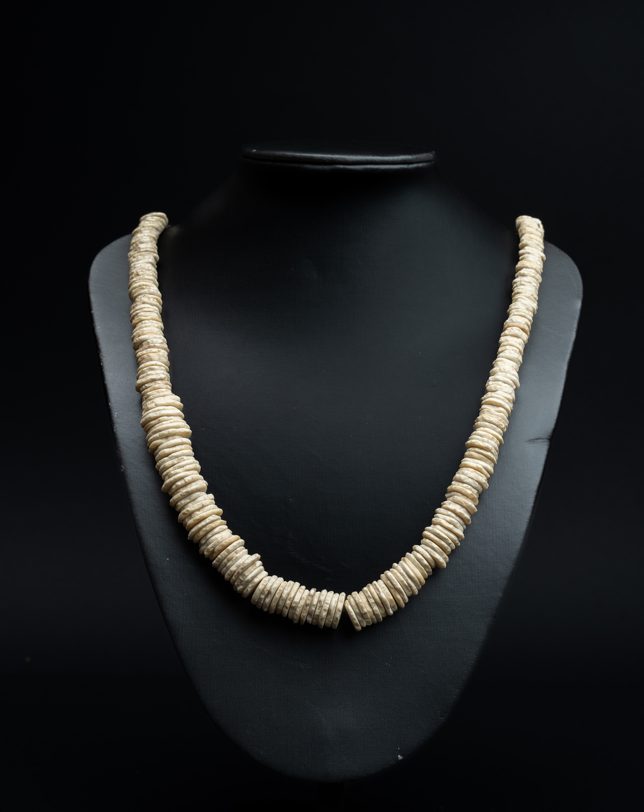 Kalahari. . Cm 1,50 x 37,00. Questa antica collana, composta interamente da dischetti di guscio di uova di struzzo è stata costruita ed indossata dalle donne del popolo San o Boscimani del deserto del Kalahari tra Botswana, Namibia e Sud Africa. Ogni dischetto è stato ridotto in forma rotonda e perforato con strumenti primitivi, tanta pazienza ed una certa maestria data la fragilità del materiale usato. I dischetti calibrati in stessa misura sono poi stati infilati con filo di cotone.