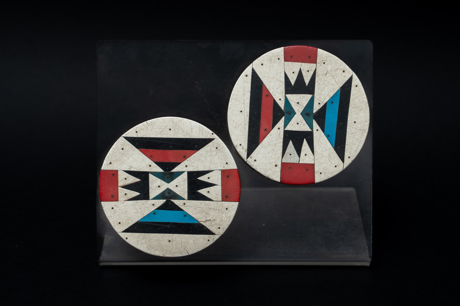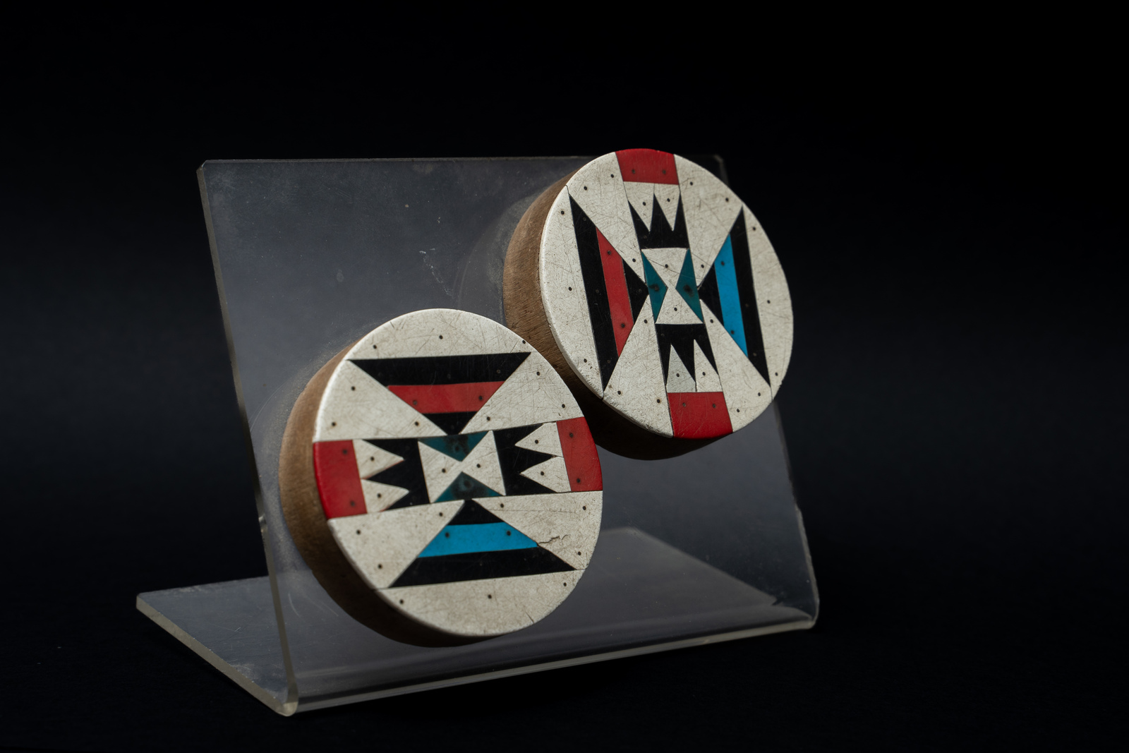 Con base in plexiglass. . Cm 6,00 x 6,00 x 1,50. Nel XIX secolo, durante alcuni riti d'iniziazione, gli Zulu del Sud Africa prevedevano l'uso di perforare i lobi delle orecchie per poi provocarne l'allugamento tramite l'utilizzo di orecchini come questi dato che una donna con i lobi perforati ed allungati risultava più attraente per i canoni estetici dell'epoca.
