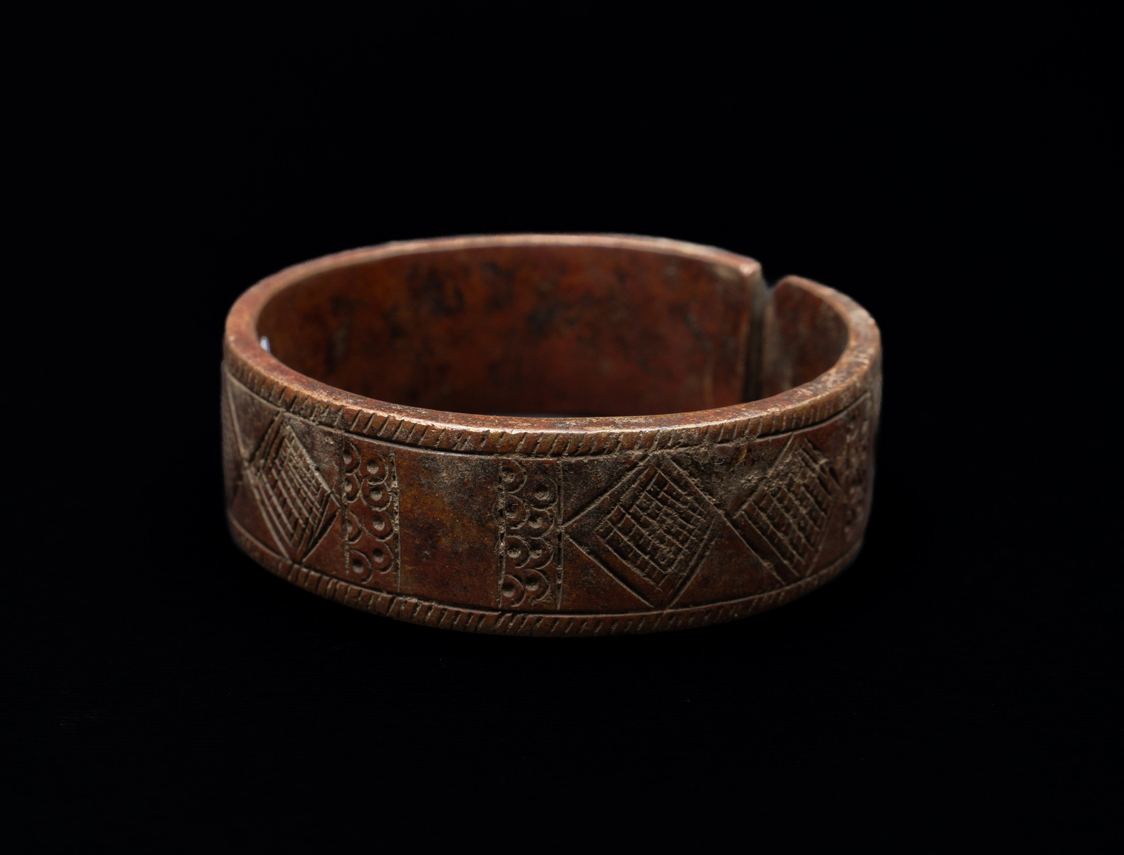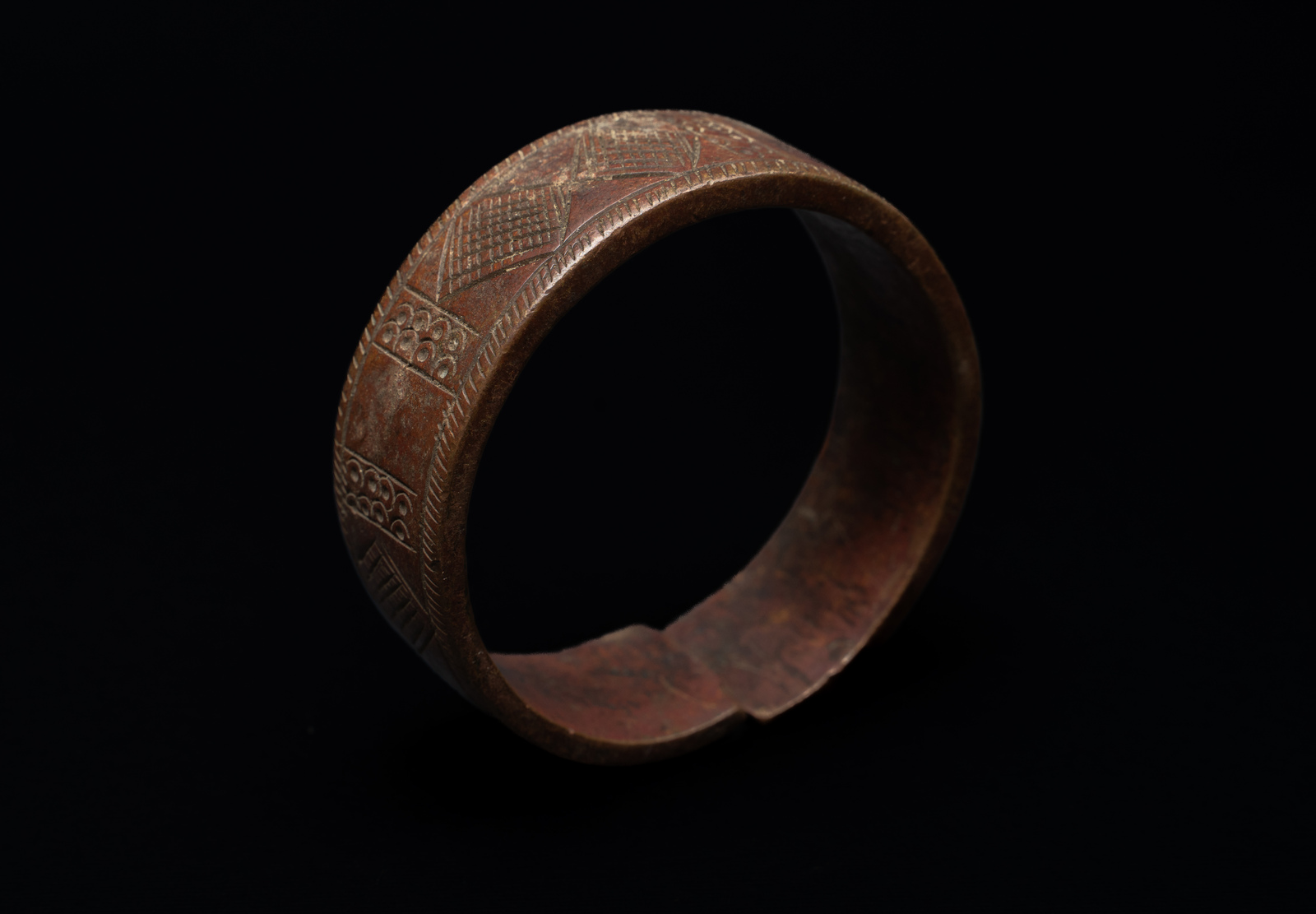 Rame. . Cm 8,50 x 8,00 x 2,60. Bracciale rigido in rame con decorazioni incise a motivi geometrici.