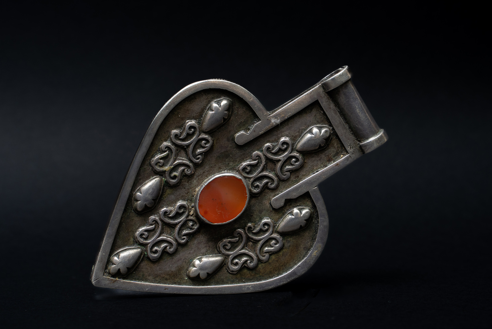 Arte Islamica - Turkmanistan. Pendente dorsale Asyk. Argento e corniola.