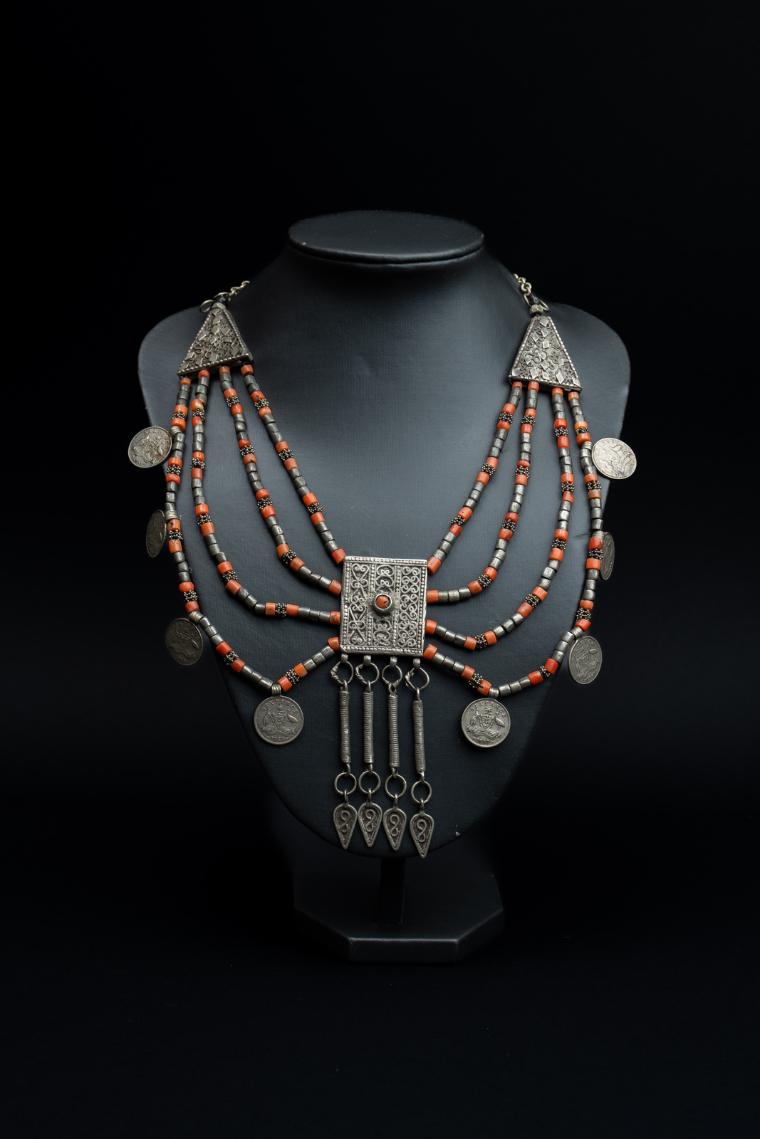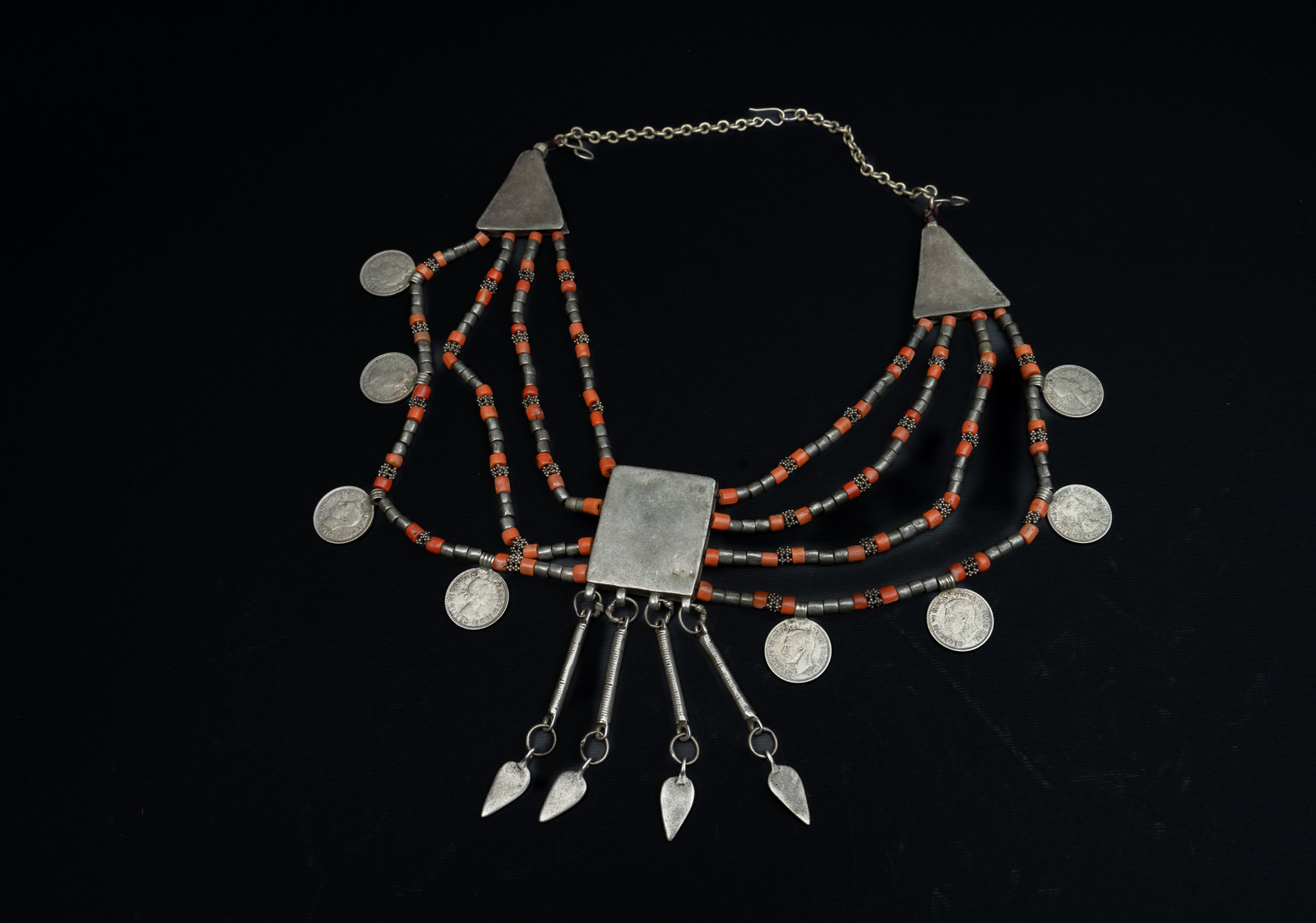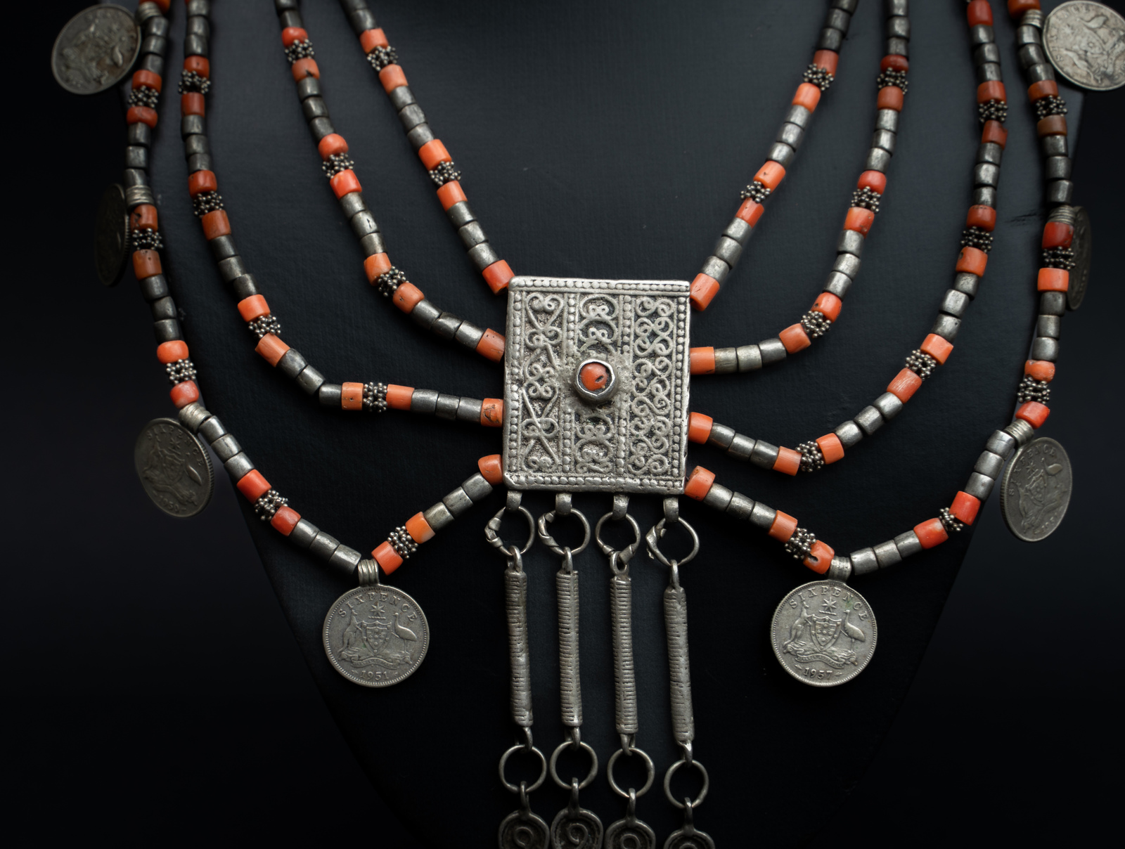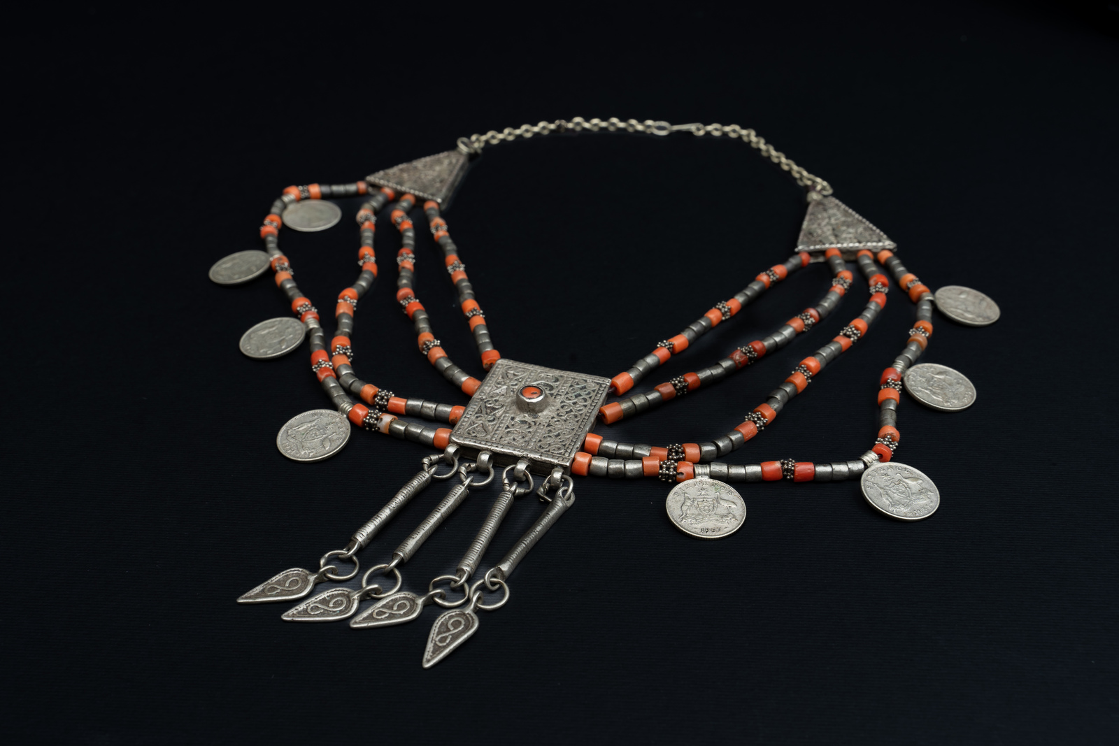 Argento, corallo e monete. . . Cm 12,00 x 47,00 x 1,00. Splendida collana in argento e corallo di incerta zona di provenienza, dato che i complessi decori che caratterizzano la placca centrale in argento richiamano alla mente stilemi di lavorazione sia yemenita che caucasici, mentre le otto monete che impreziosiscono il bordo inferiore provengono dall'Australia.