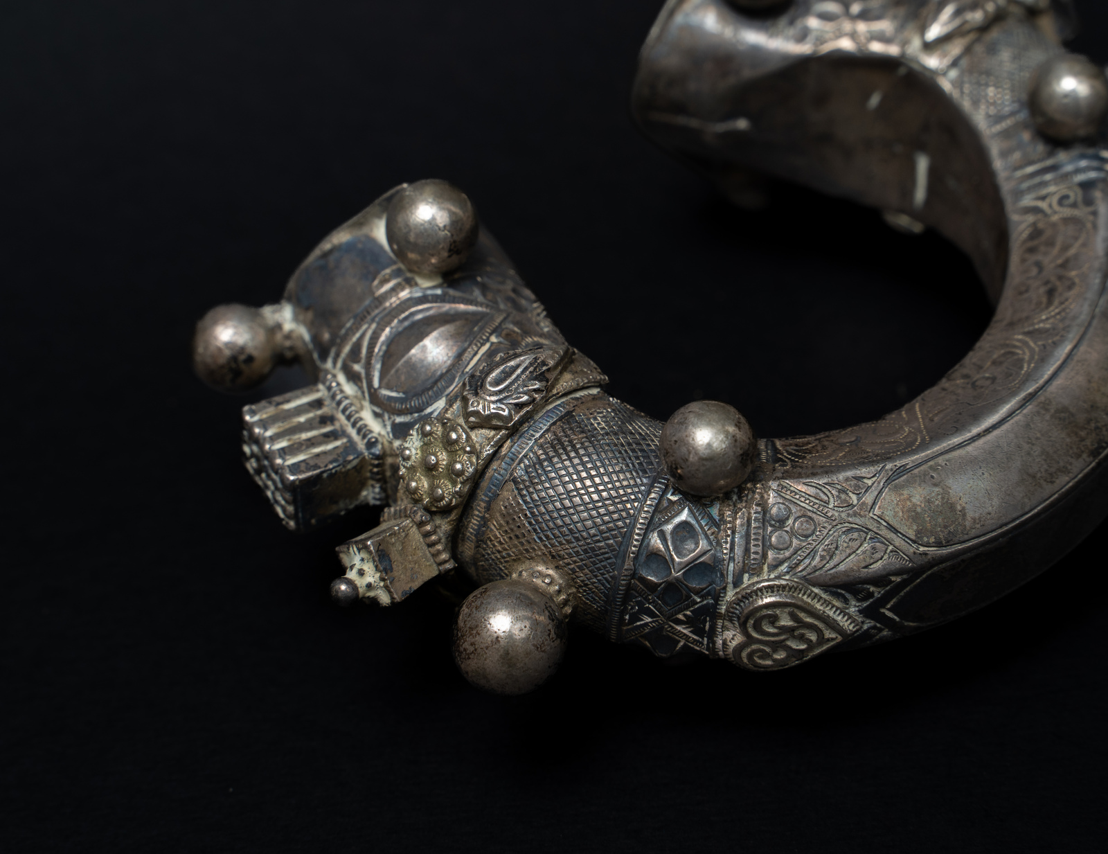 . . Cm 12,00 x 9,00 x 4,00. Splendido esemplare di bracciale in argento a canna vuota realizzato dai Pashtuni che popolano la regione Swat del Pakistan. Tipicamente lavorato con volumi geometrici e riccamente inciso, questo iconico gioiello pakistano presenta alle estremità le caratteristiche teste leonine con fauci spalancate ispirate dal Makara indiano.