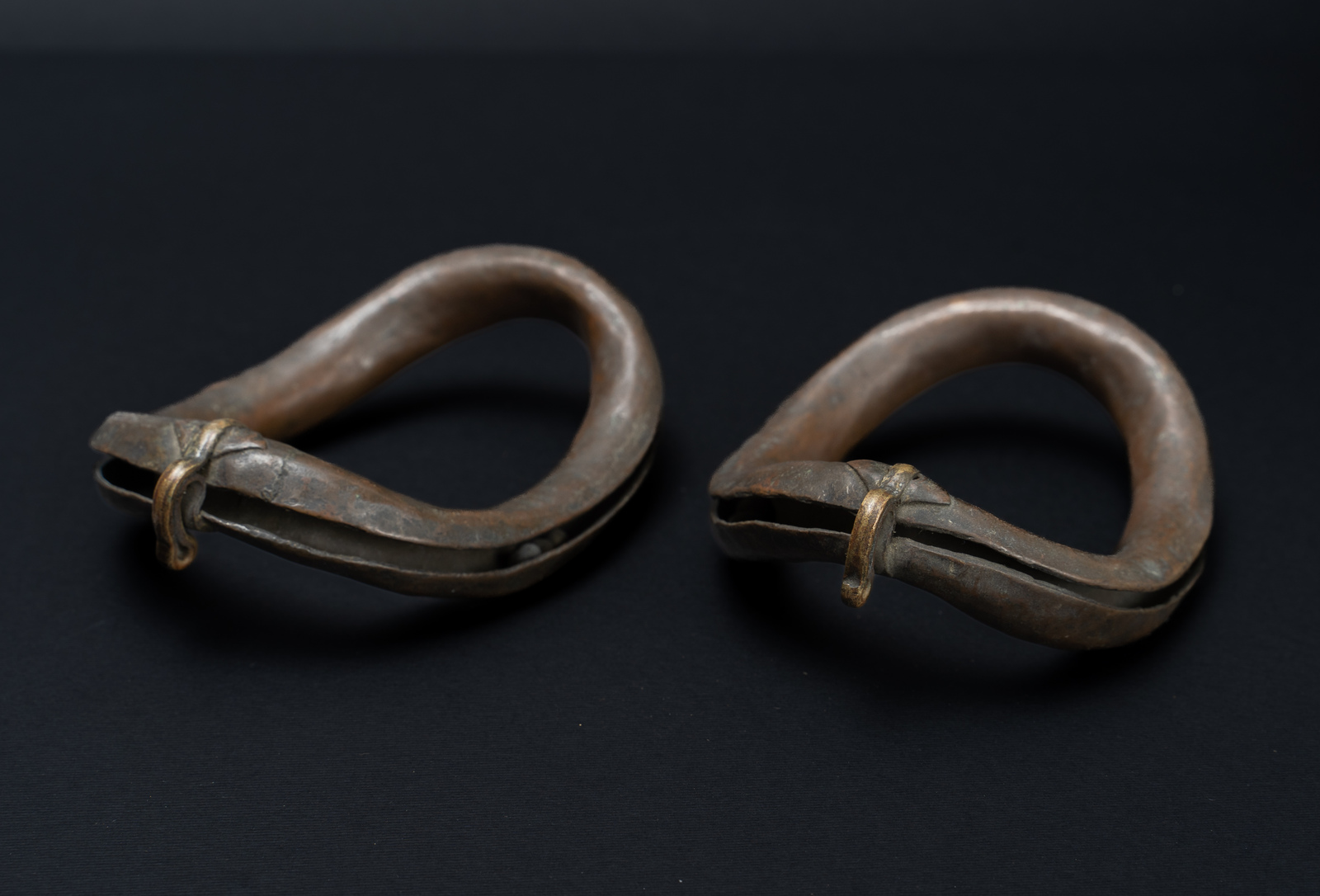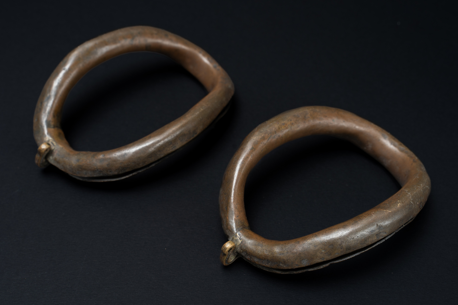 . . Cm 11,00 x 15,00 x 2,00. Coppia di pesanti cavigliere indiane in bronzo utilizzate dalle donne che lavoravano nei campi per allontanare rettili e piccoli animali con il tipico suono prodotto ad ogni passo dai sassolini contenuti all'interno delle cavigliere cave.