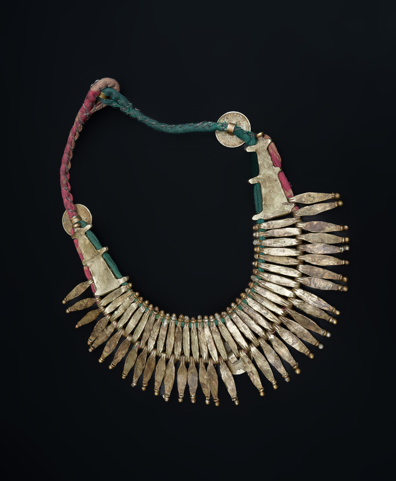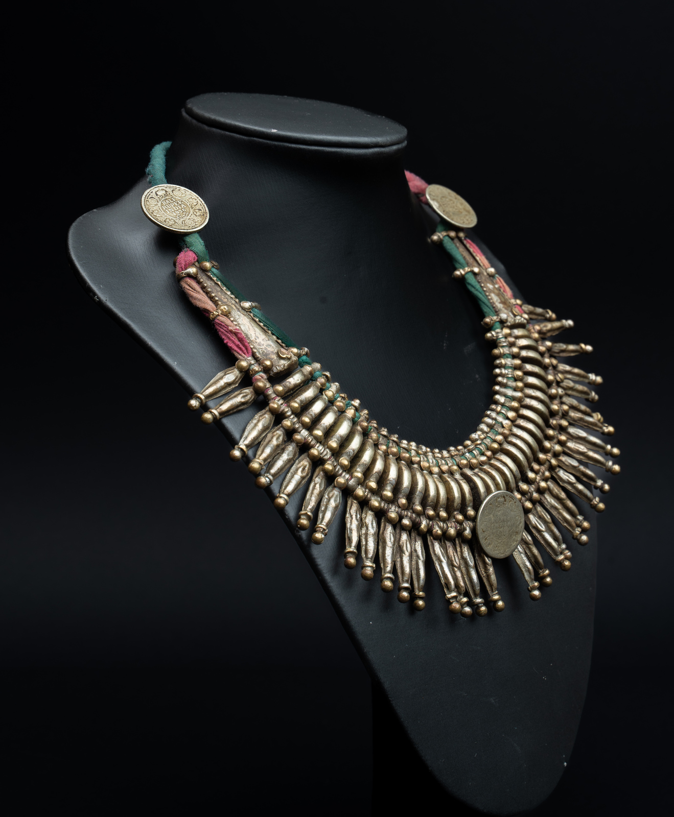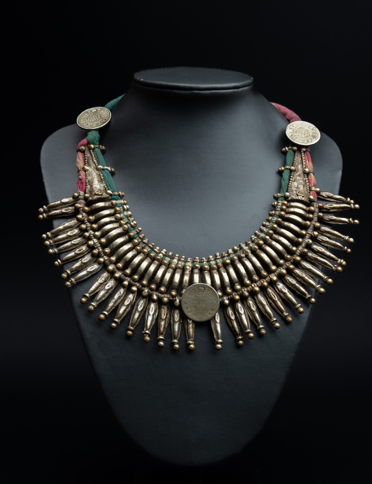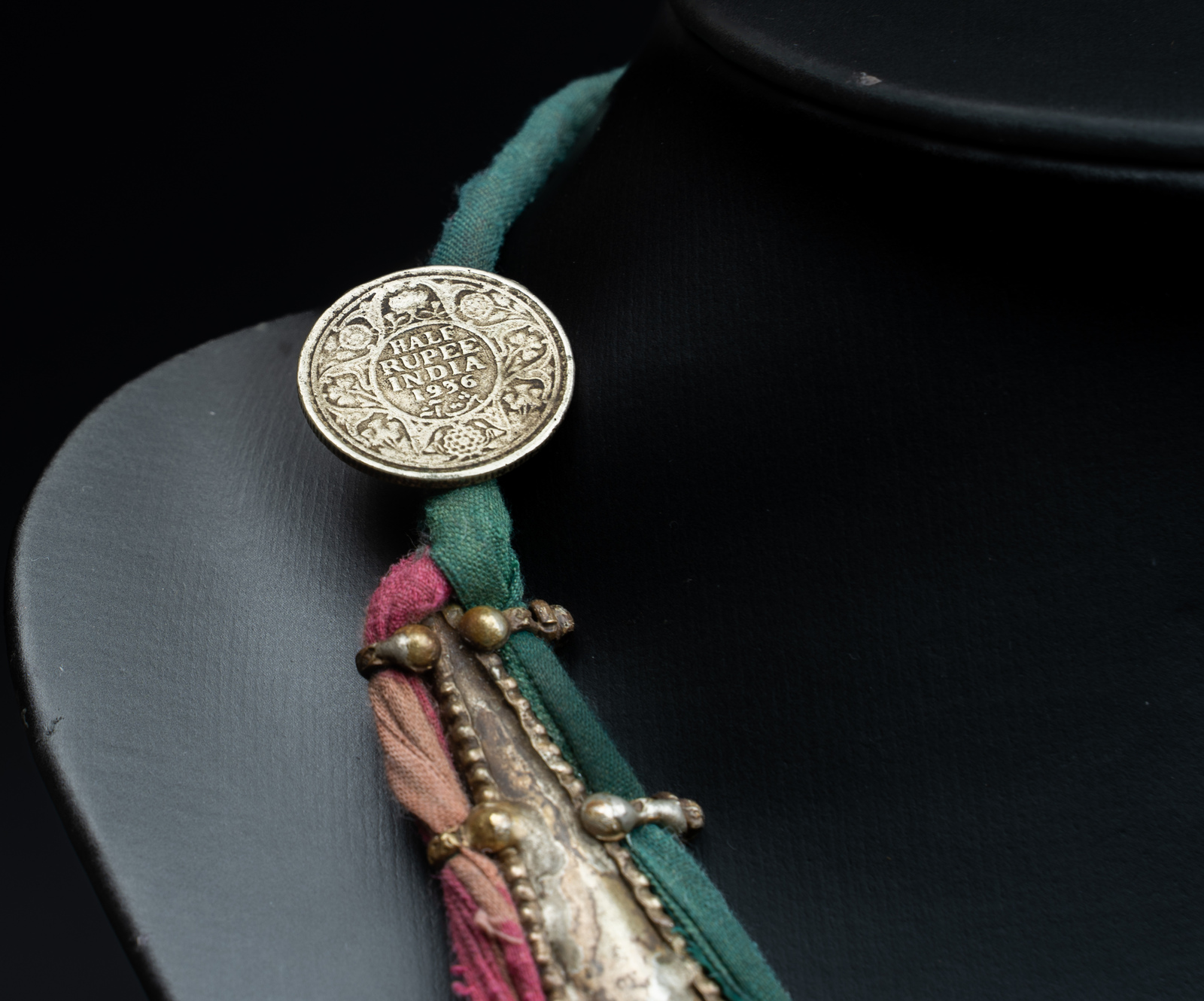 Arte Indiana - India. Collana. Lega d'argento, monete e tessuto. .