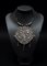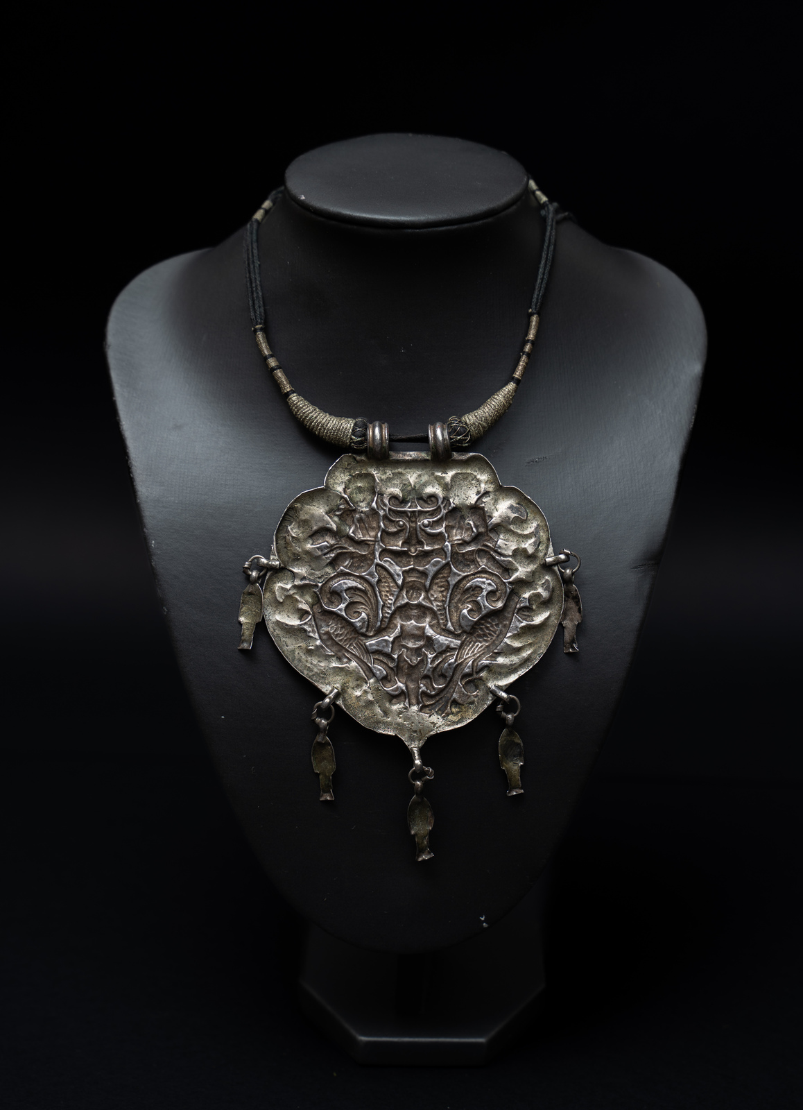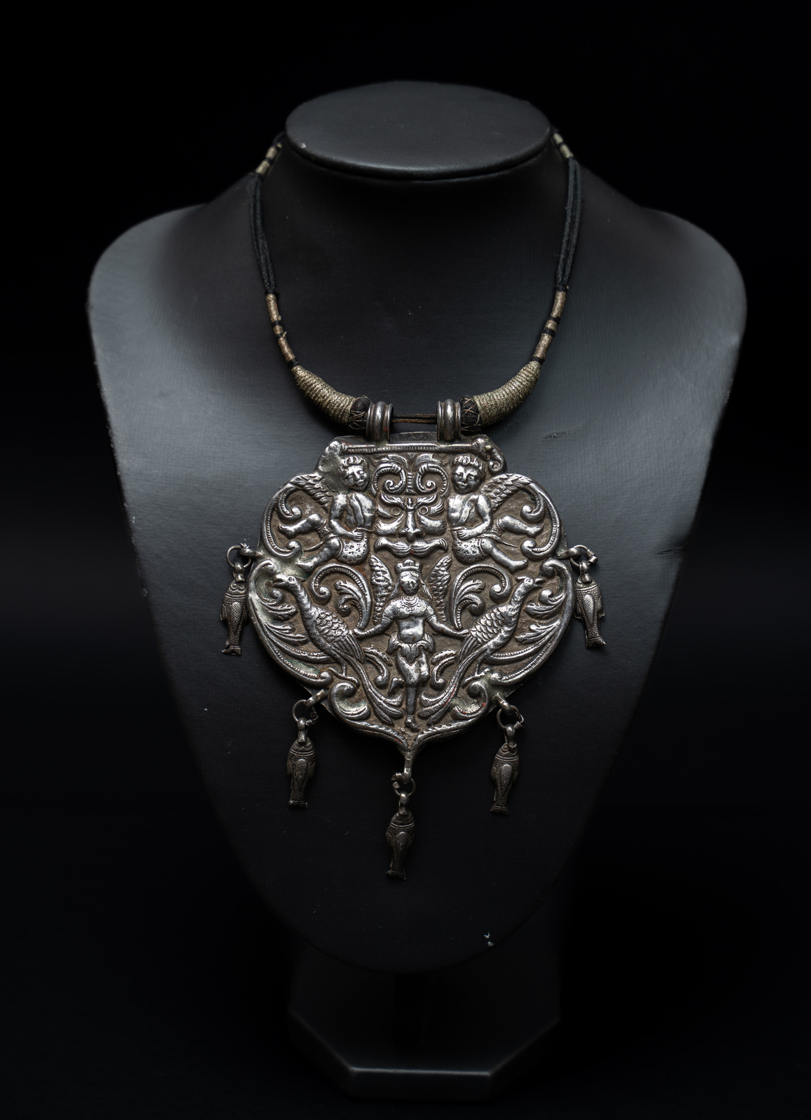 Argento e cotone. . Cm 14,00 x 10,50 x 1,50. Collana in cotone e fili d'argento con splendido pendente in argento riccamente decorato a sbalzo con figura centrale incoronata e danzante, circondata da angeli, un mascherone e due pavoni. Impreziosito da cinque pendenti a forma di pesce, questo monile di grande qualità ci è pervenuto in ottimo stato di conservazione e con una magnifica patina.