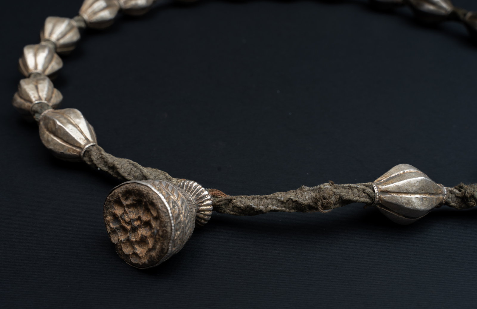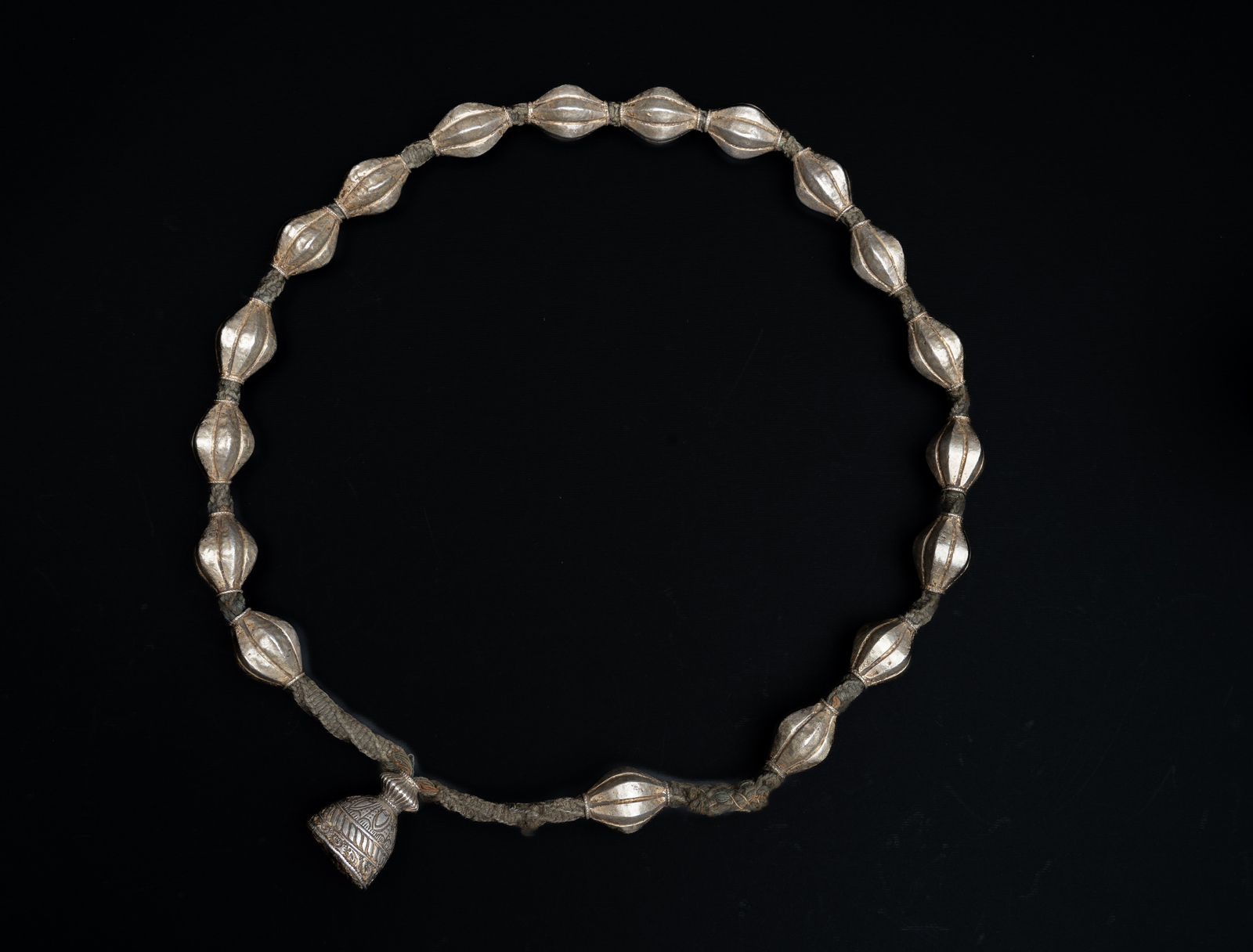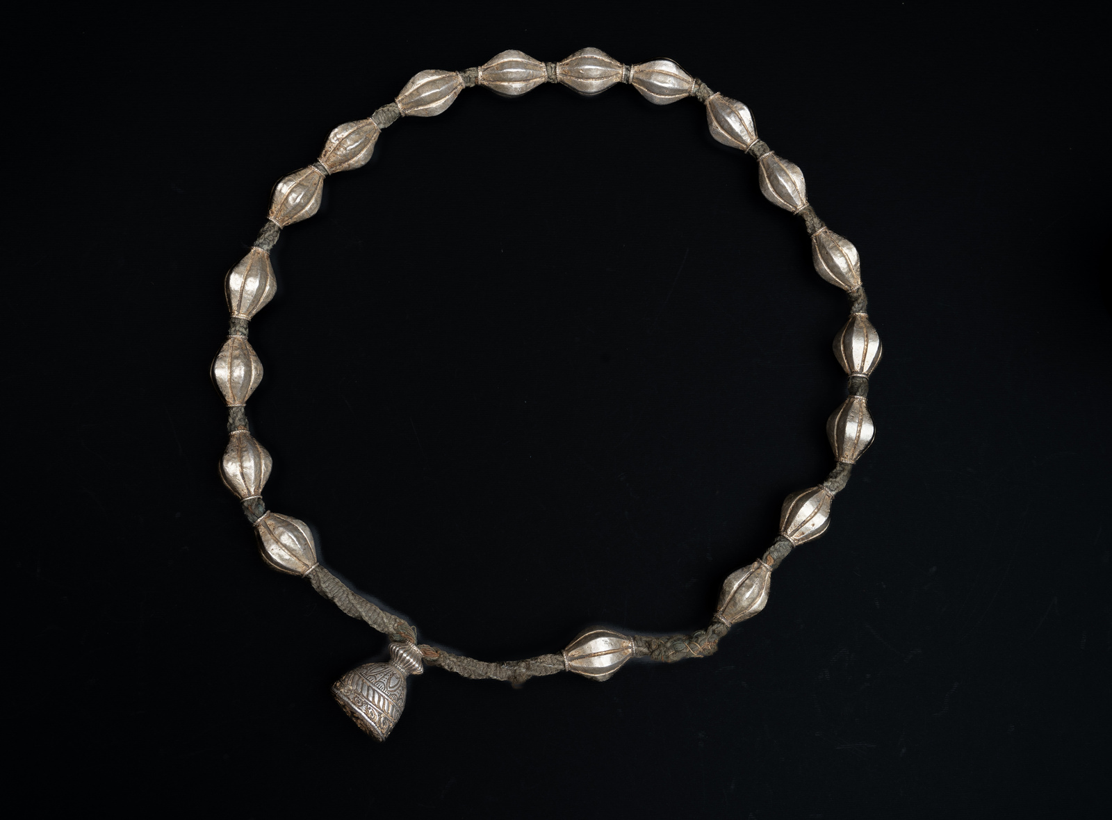 . . Cm 3,50 x 48,00 x 3,50. Bella ed antica collana nepalese composta da 18 grani in lamina d'argento su cera ed un pendente nella cui base in cera sono rimaste impresse impronte di semi oggi mancanti.