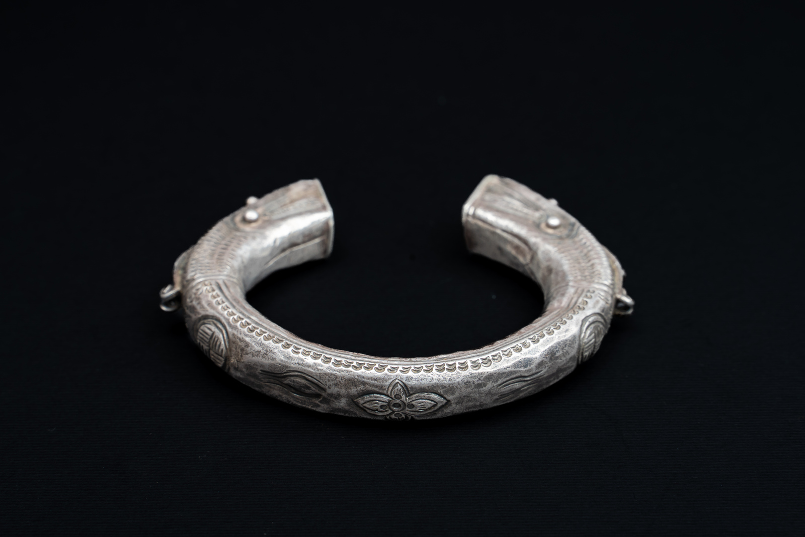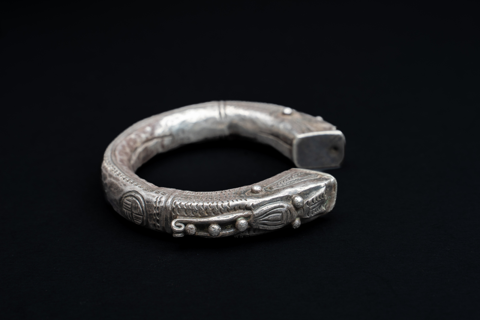 . . Cm 8,00 x 10,00 x 1,50. Bel bracciale in argento a canna vuota con le estremità a forma della tradizionale testa di drago con cui il popolo Yao evoca l'antenato primordiale Panhu, l'uomo drago-cane.