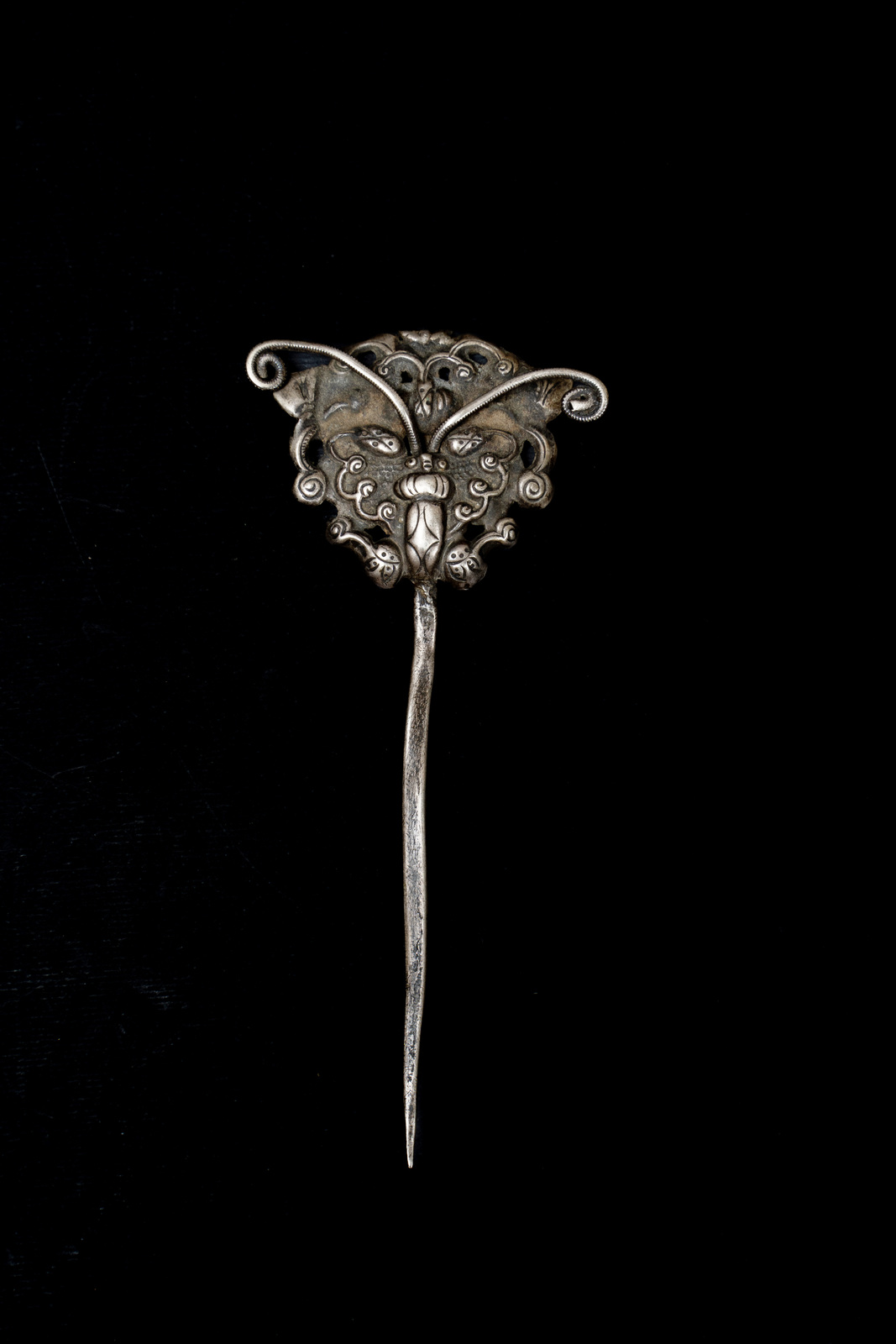Argento. . . Cm 5,30 x 12,00 x 1,50. Spilla per capelli in argento a forma di farfalla sapientemente lavorata dagli artigiani cinesi di epoca Ching.