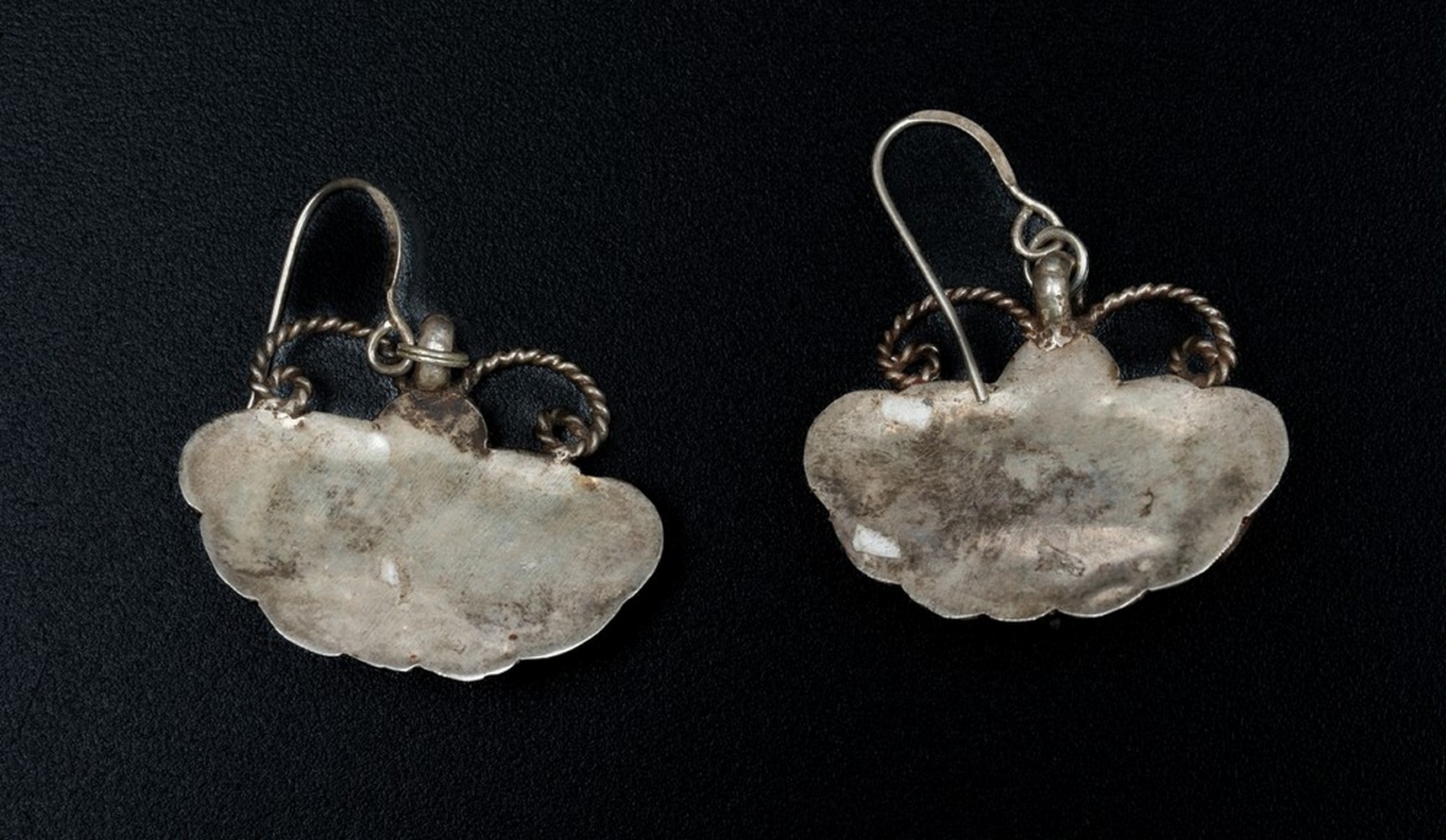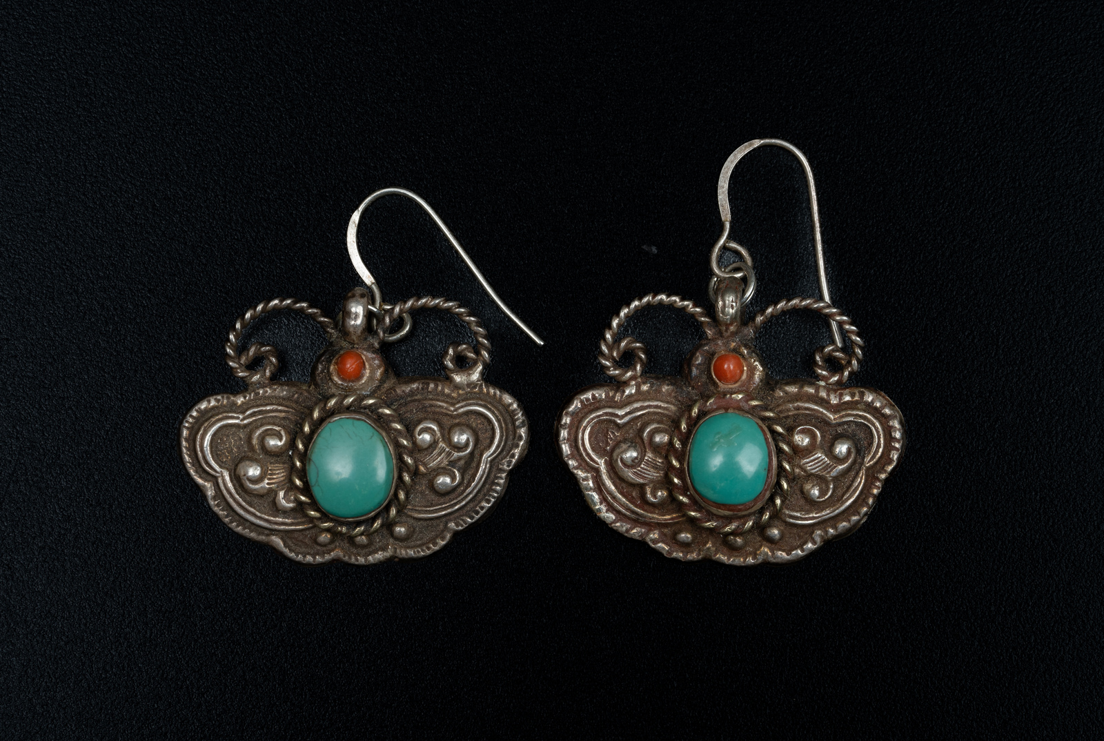 Arte Cinese - Cina. Coppia di orecchini. Argento, turchese e corallo. .