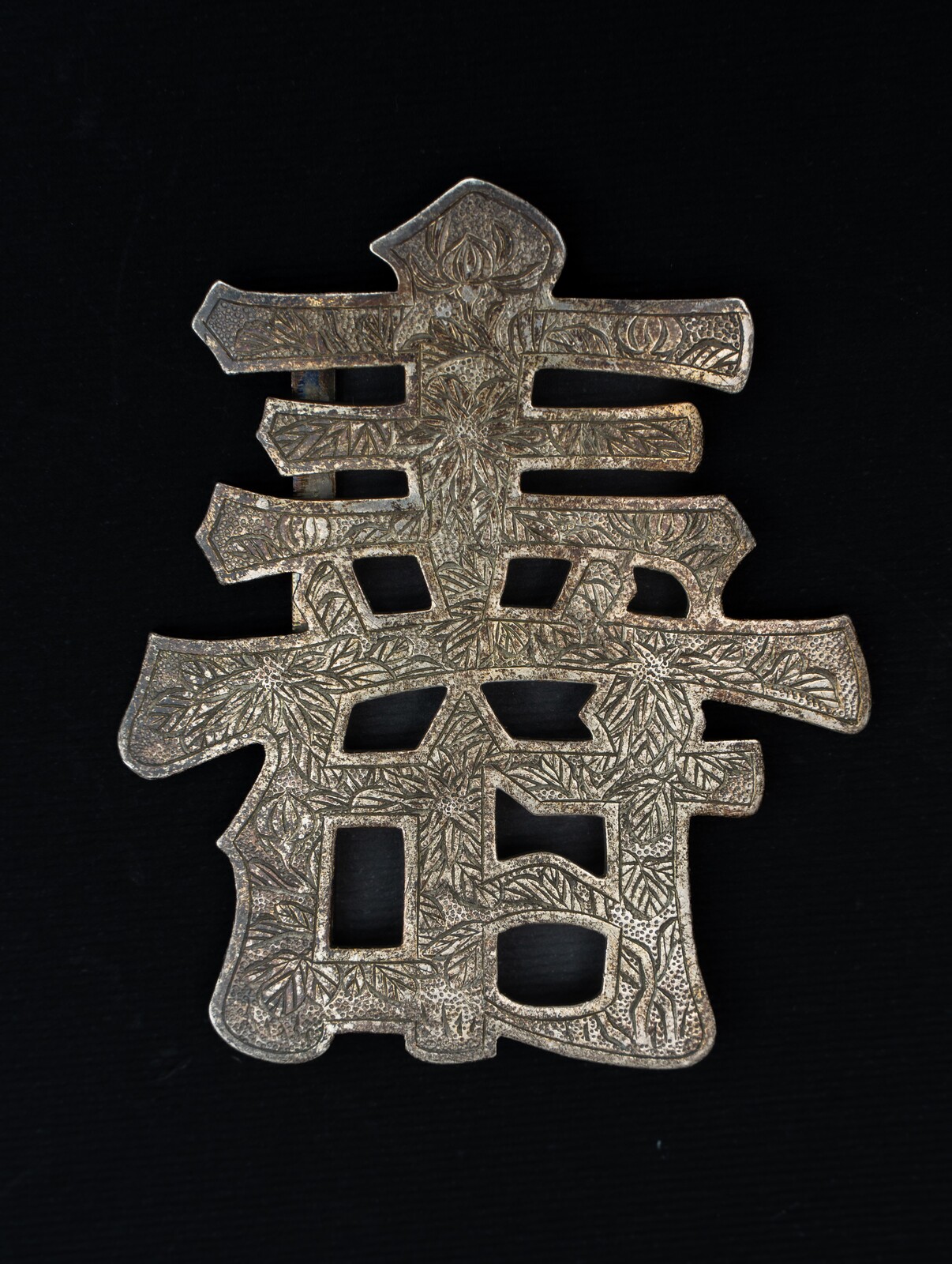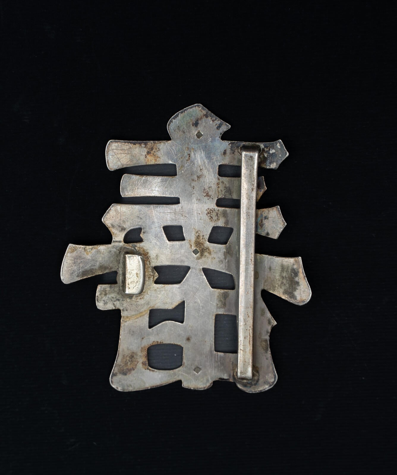 Argento. . Cm 6,40 x 7,40 x 0,50. Fibbia da cintura in argento con ideogramma cinese di longevità.