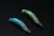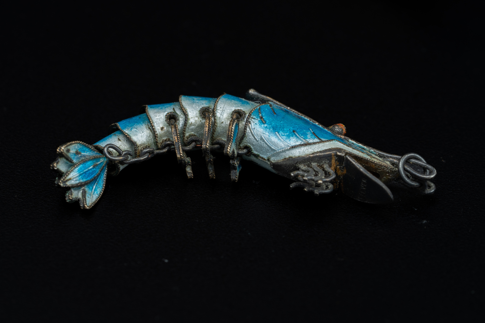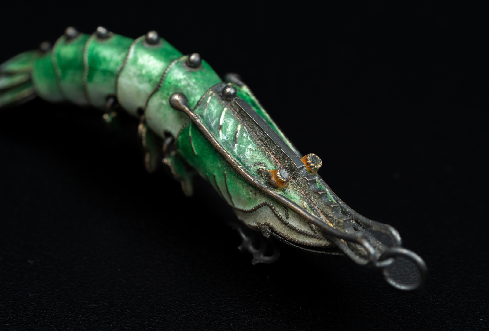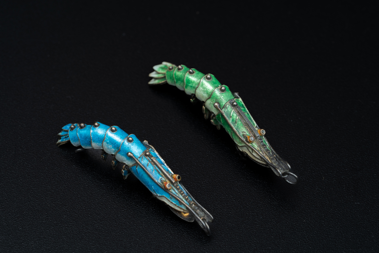 Argento smaltato. . Cm 1,00 x 5,50 x 0,60. Deliziosa coppia di pendenti a forma di gamberetti in argento e smalto nei colori del blu e verde.