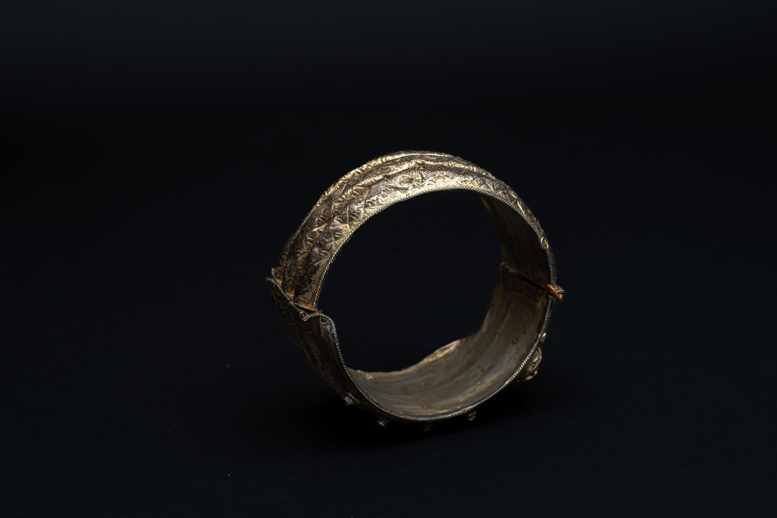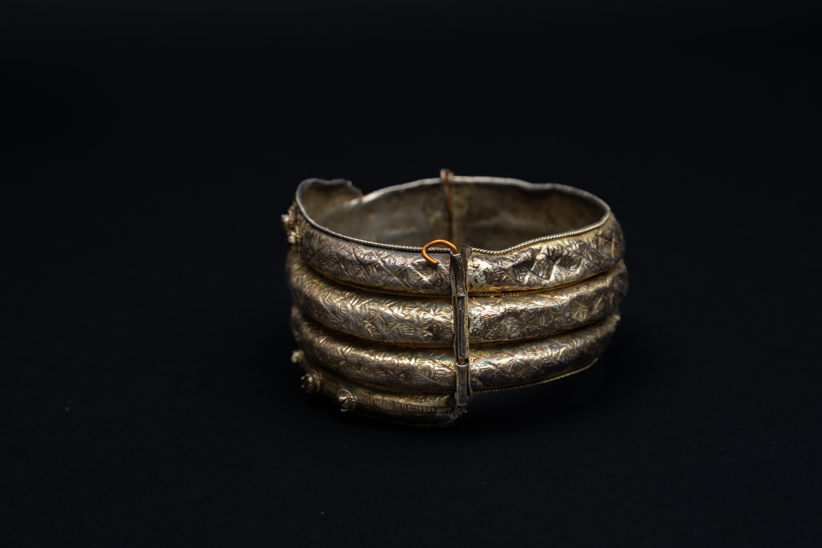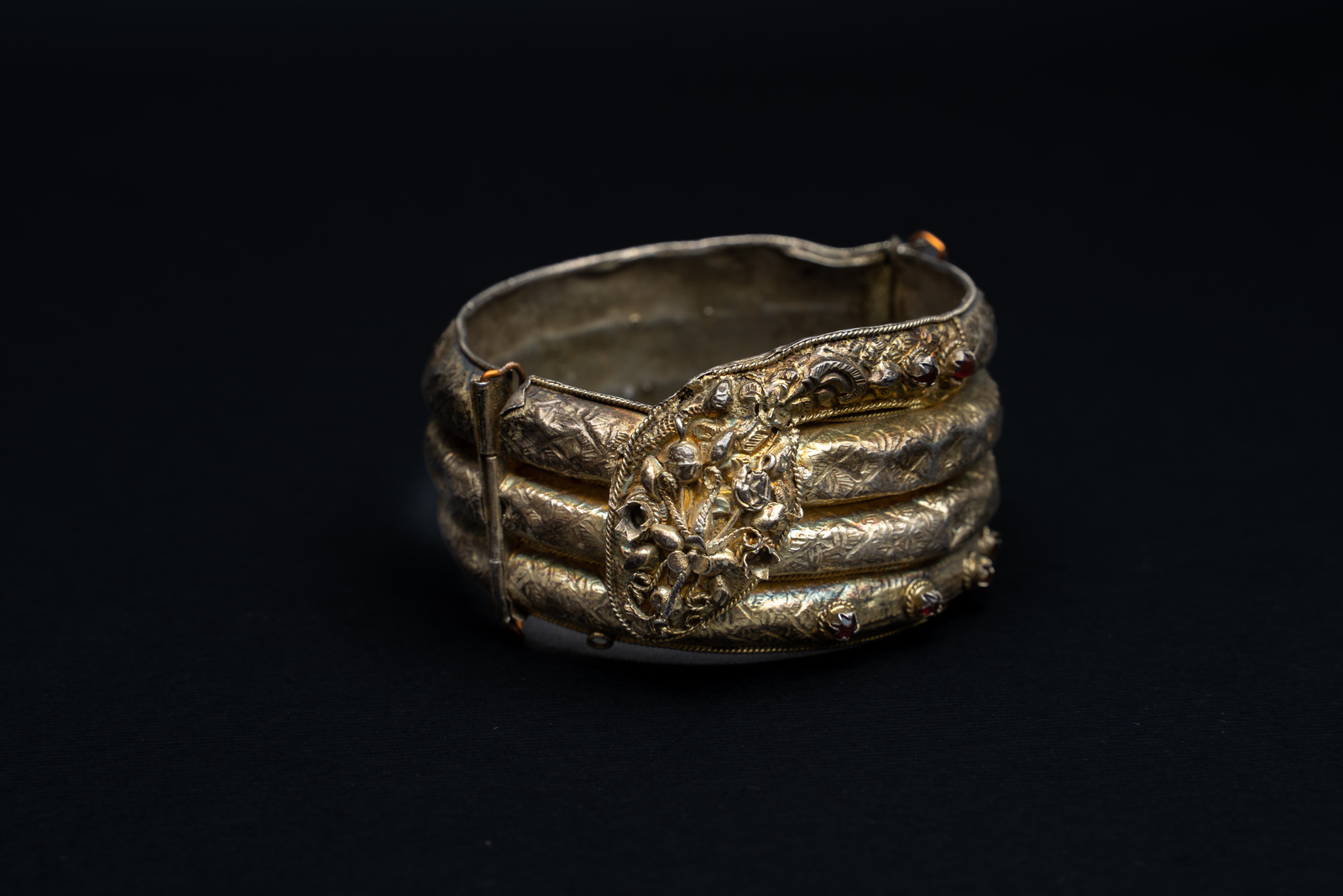 argento e vetri colorati. . . Cm 7,50 x 4,00 x 1,50. Antico e splendido bracciale a forma di serpente realizzato a canne vuote in filigrana d'argento dorato, con cerniere ed elaboratamente inciso a motivi geometrici ed impreziosito da vetri colorati faccettati.
