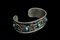 Argento e turchesi tagliati a mano. . . Cm 2,40 x 6,80 x 4,50. Bracciale rigido in argento e turchesi lavorato con tecniche di lavorazione tradizionali ed inciso con i motivi classici della cultura Navajo. Anche le piccole pietre turchesi risultano lavorate e levigate a mano.