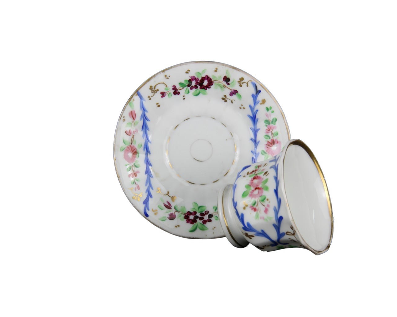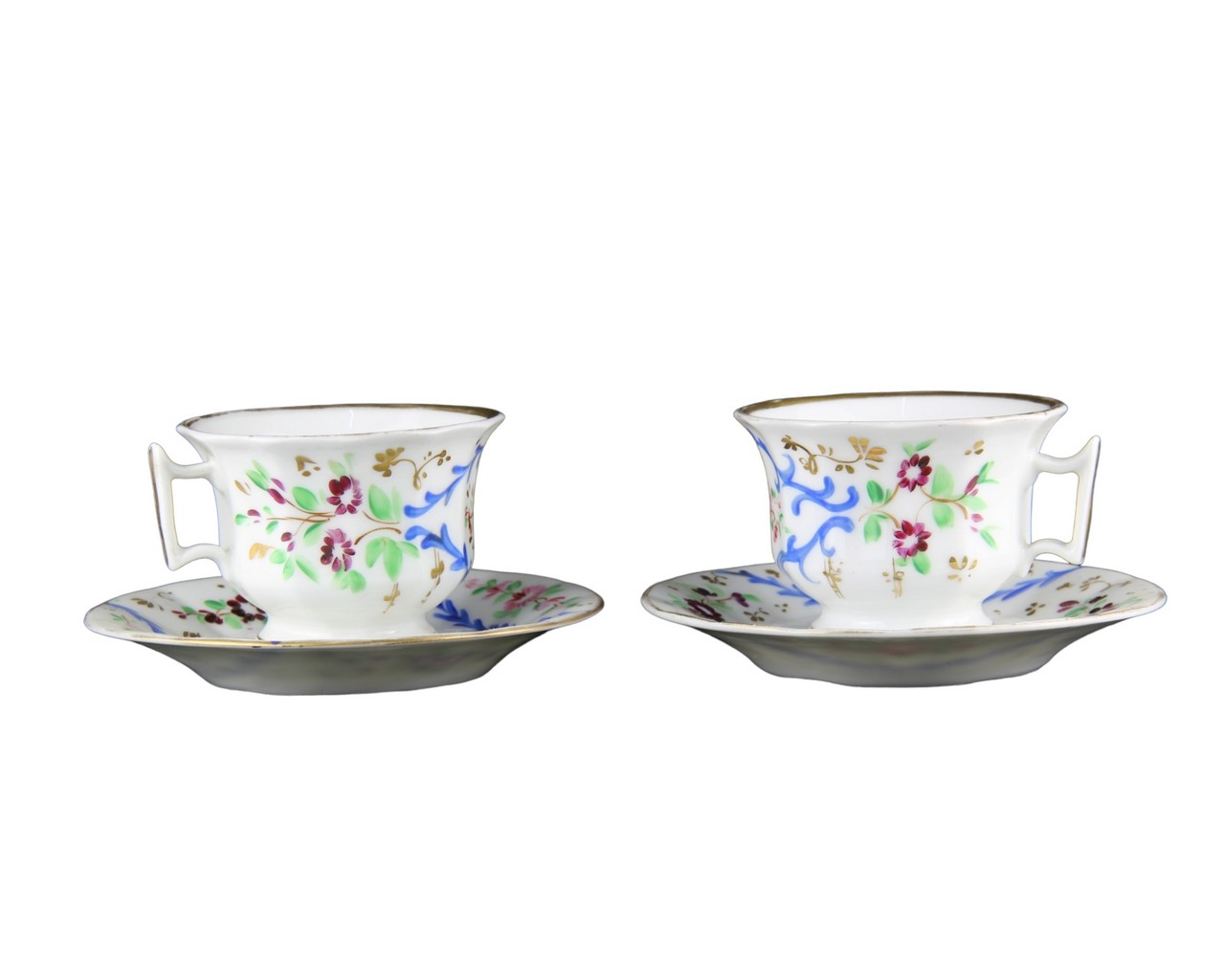 COPPIA DI TAZZINE in porcellana decorata a motivi floreali manifattura francese . XIX secolo h cm 6 X 8,5 , piattino cm D 13