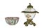 LOTTO COMPOSTO DA 02 CIOTOLE: CIOTOLA in porcellana con coperchio montata su base in bronzo e decorata a motivi orientali E CIOTOLA decorata a motivi floreali e lumeggiature in oro, manifattura orientale XIX-XX secolo . h cm 19 X 14,3 /h cm 5,5 X 11,5