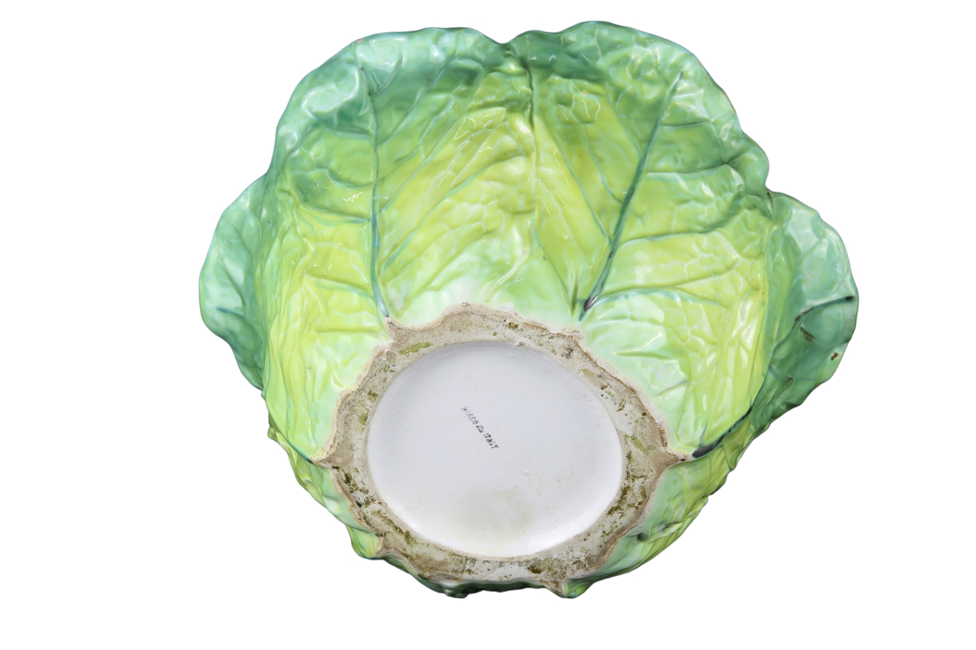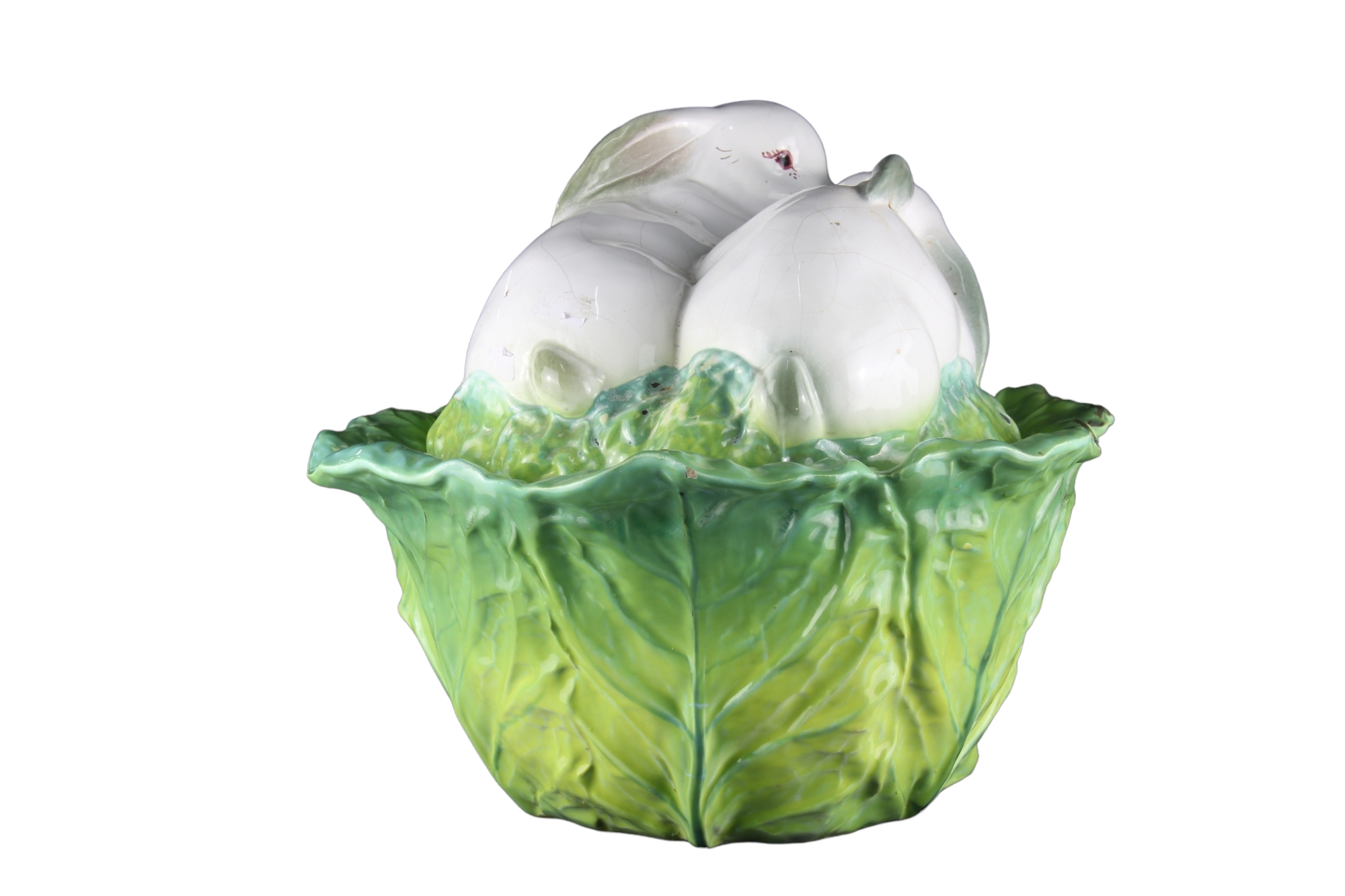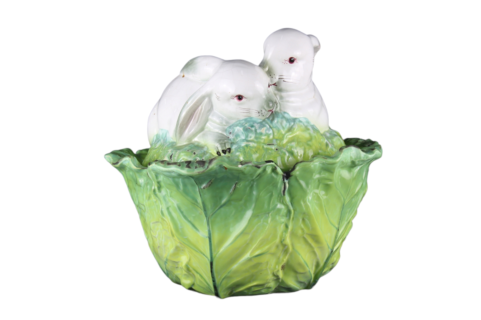 ZUPPIERA in ceramica policroma a forma di cavolo, coperchio sormontato da coppia di conigli manifattura veneta periodo Liberty. h cm 30 X 33,5