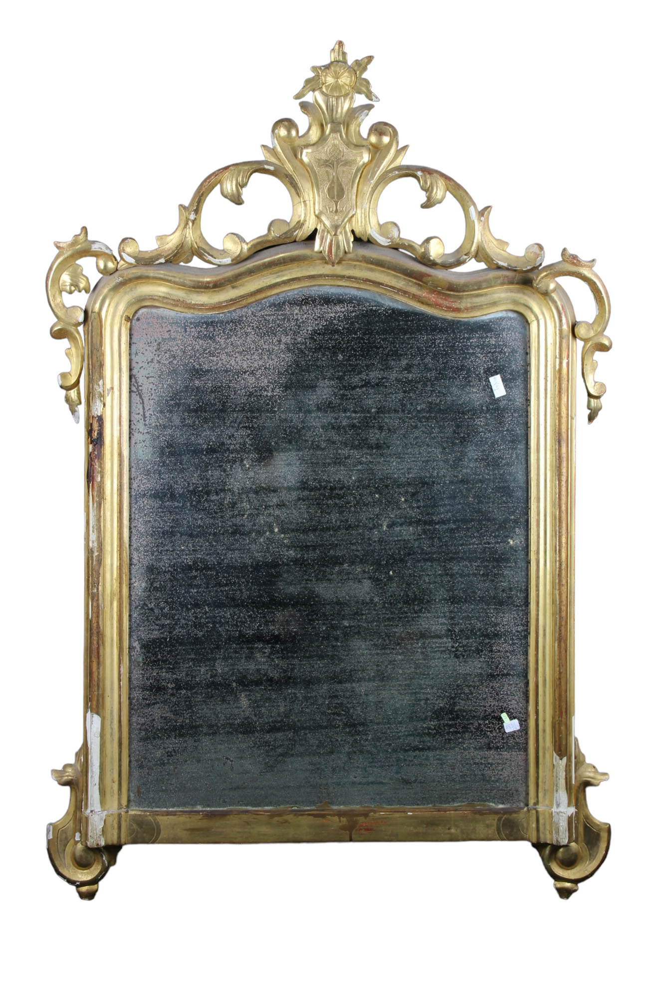 SPECCHIERA in legno intagliato e dorato con oro zecchino, cimasa traforata e decorata a motivi fogliacei. Sicilia XIX secolo . usure del tempo . h cm 122 X 81