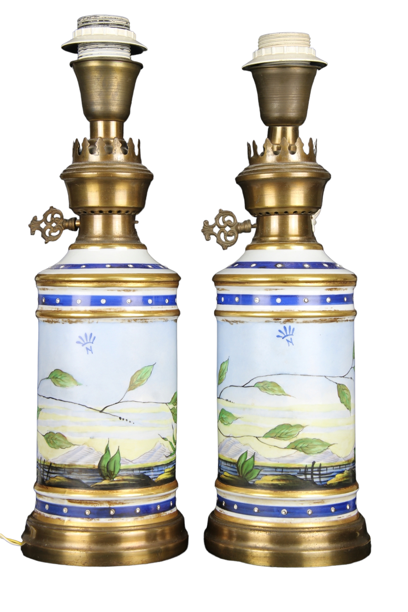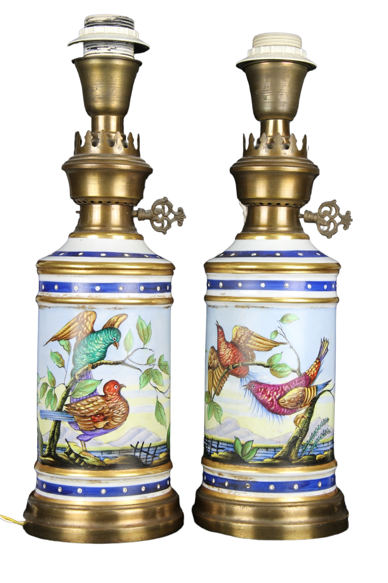 COPPIA DI LUMI in porcellana dipinta Raffigurante Scene di flora e fauna ,montatura in metallo dorato manifattura di Capodimonte .XX secolo Napoli .h cm 40 X 13