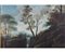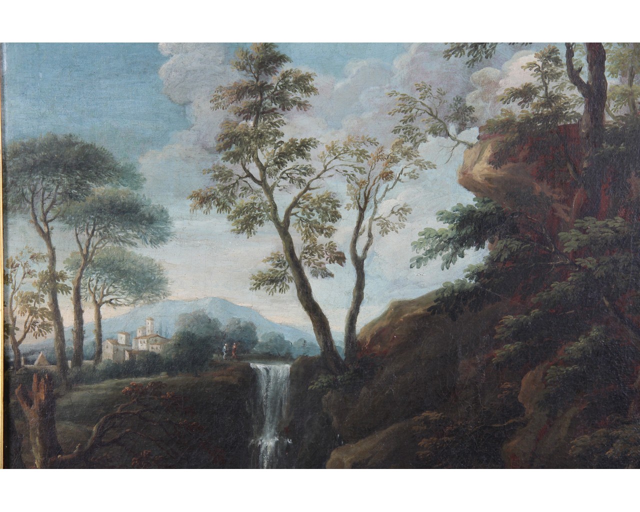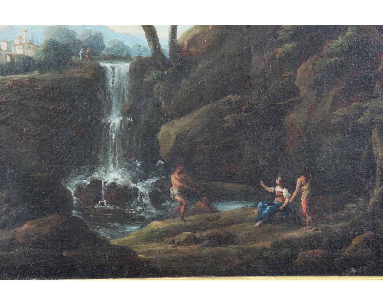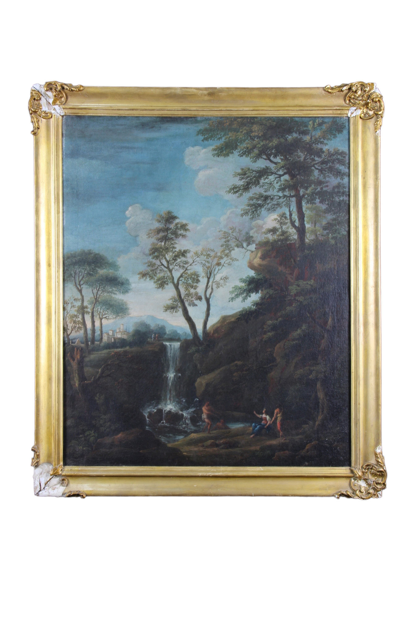 DIPINTO OLIO SU TELA Raffigurante Paesaggio con cascata e personaggi, cornice in legno dorata , scuola romana XVIII secolo .h cm 75 X 60