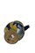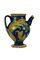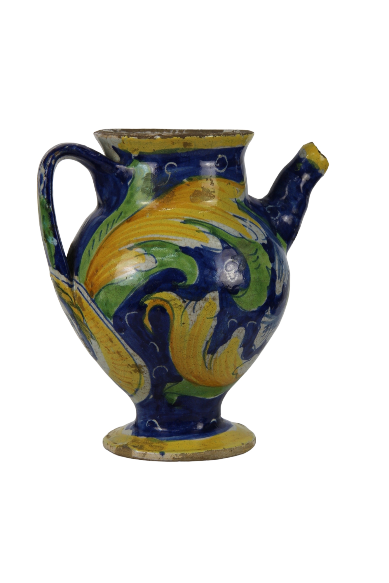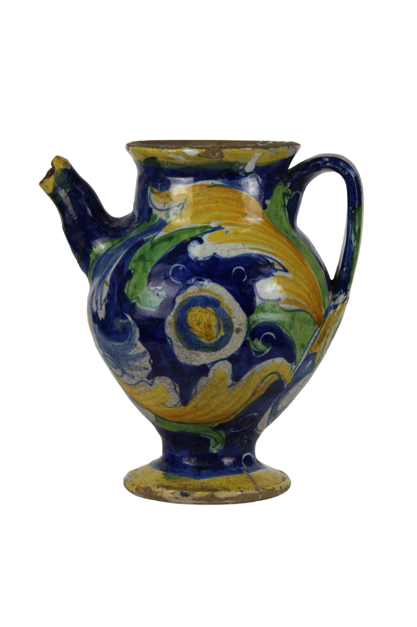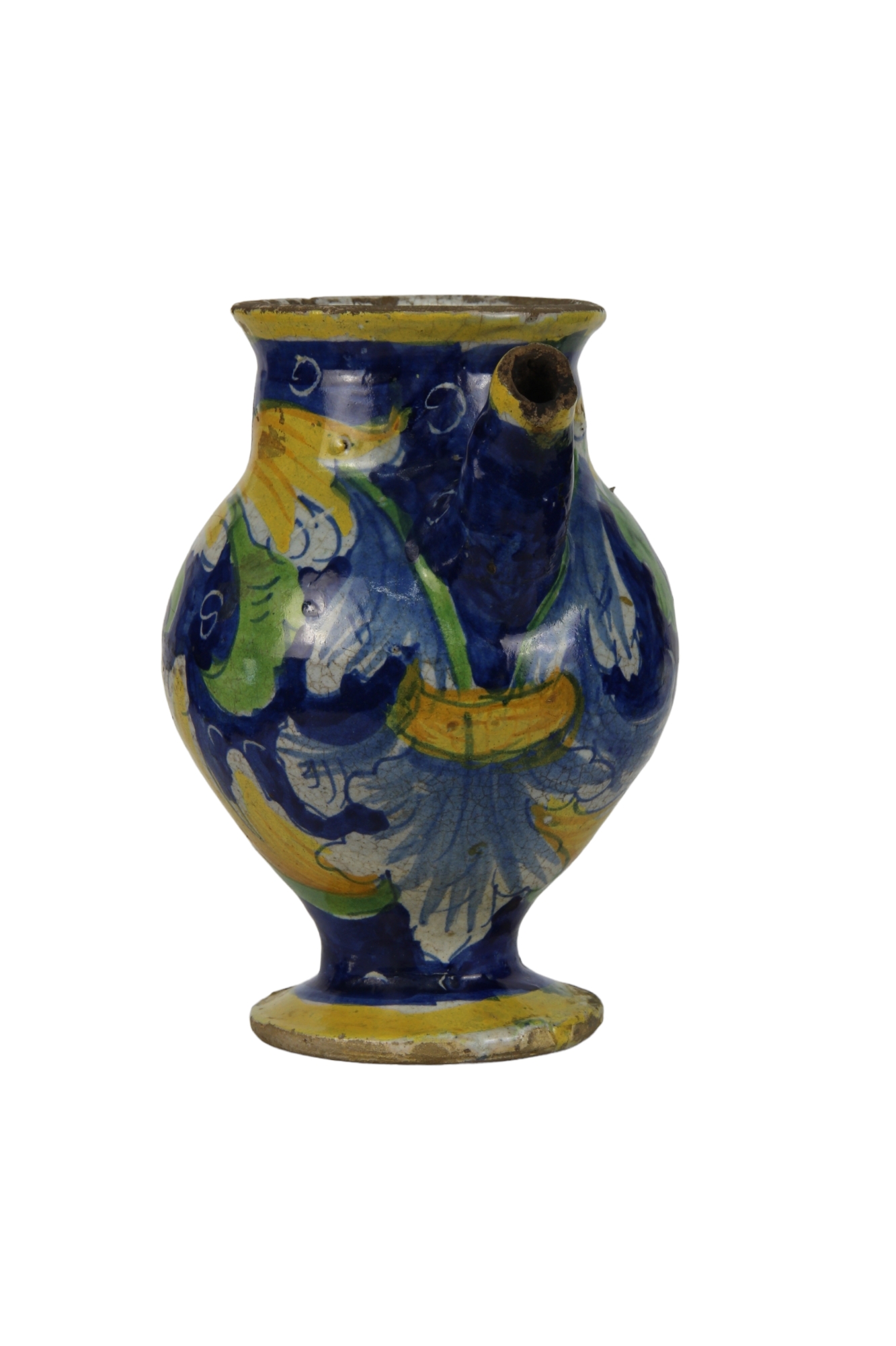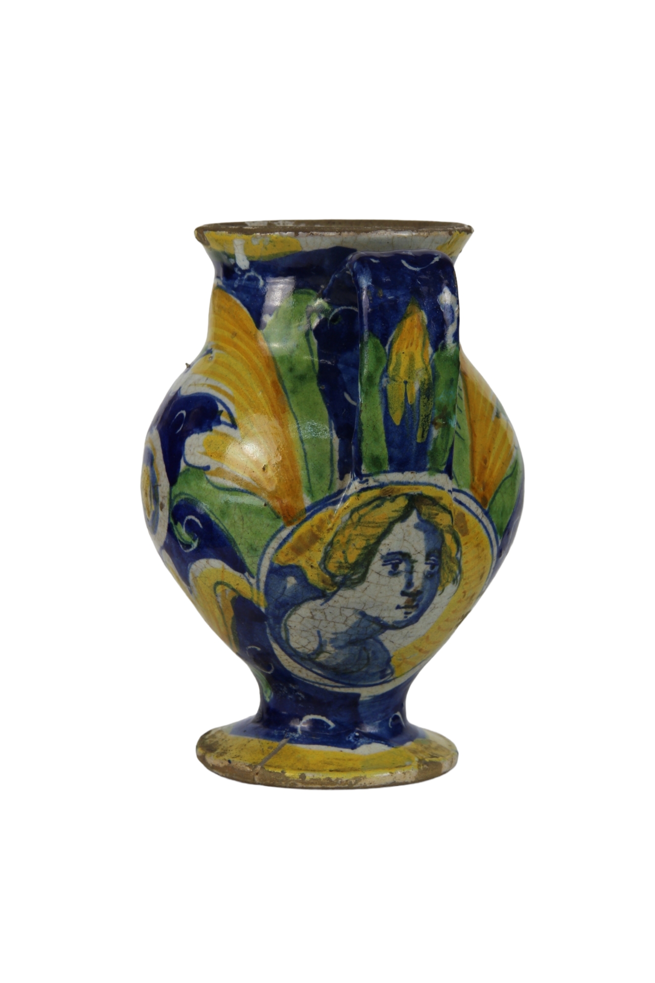 VERSATOIO in maiolica policroma decorato a tuttotondo a motivi fogliacei , figura femminile entro riserva Fine XVII secolo primi XVIII secolo Calabria. . h cm 21 x 19 x 14,5.