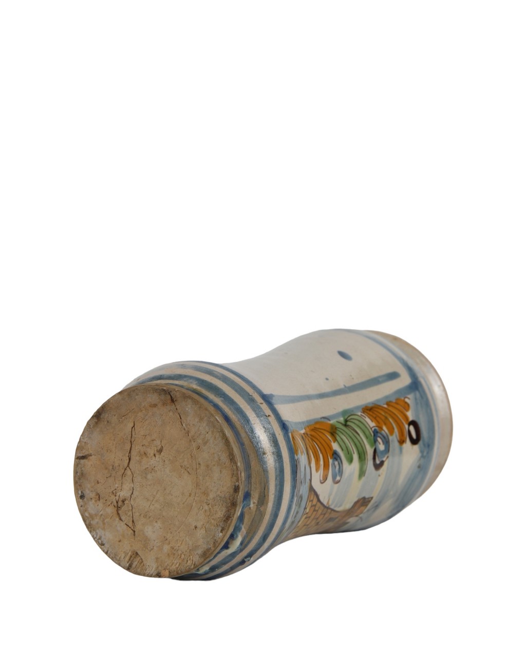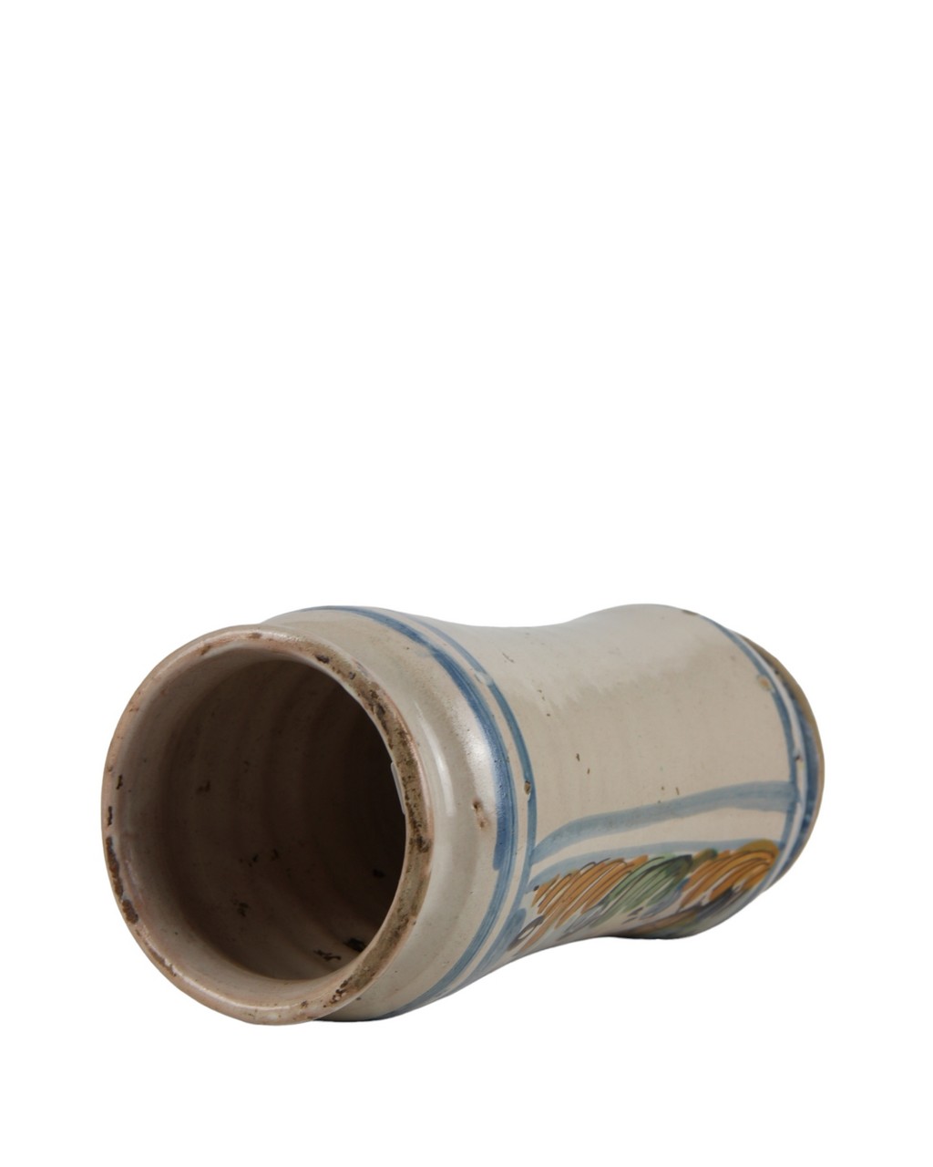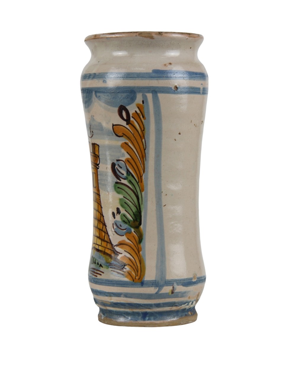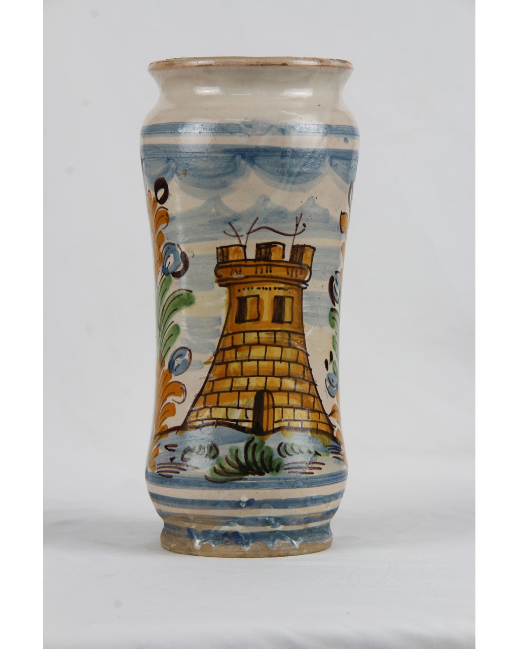 ALBARELLLO DA FARMACIA in maiolica policroma fronte decorato da paesaggio con torre. Napoli 1730/1750 circa . h cm 25,5 x 12