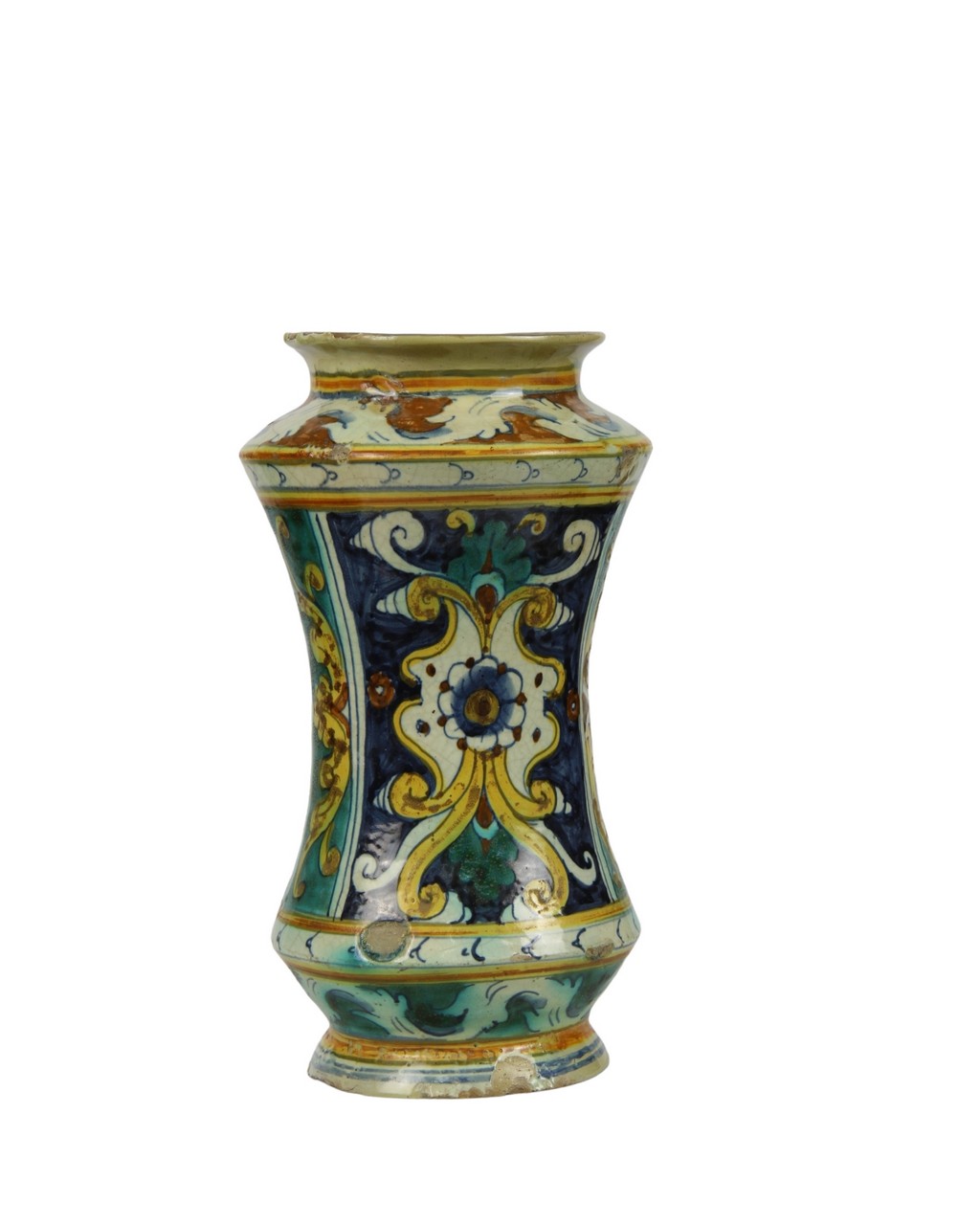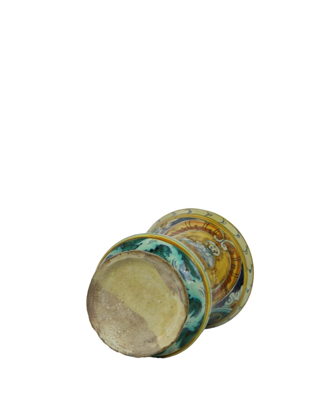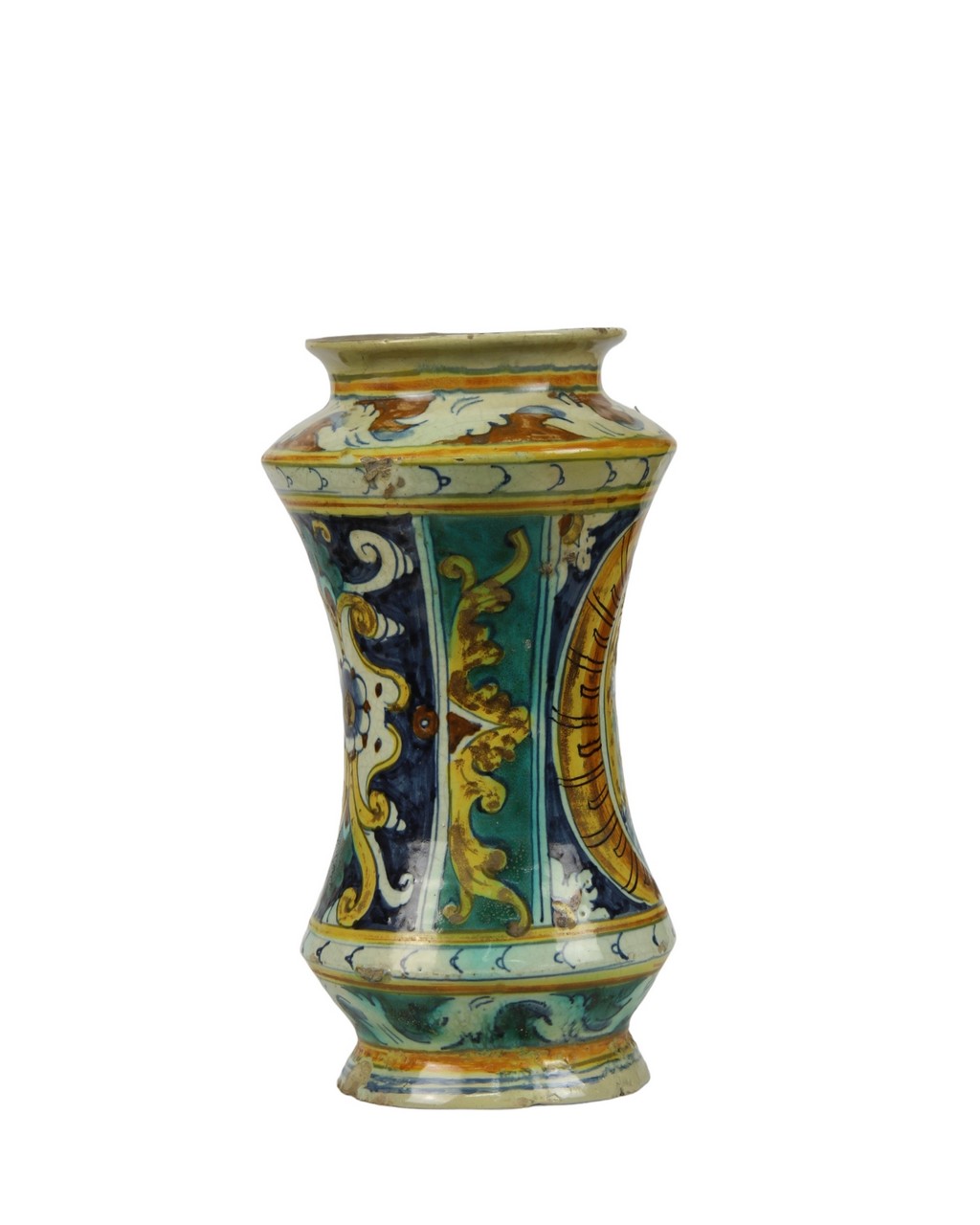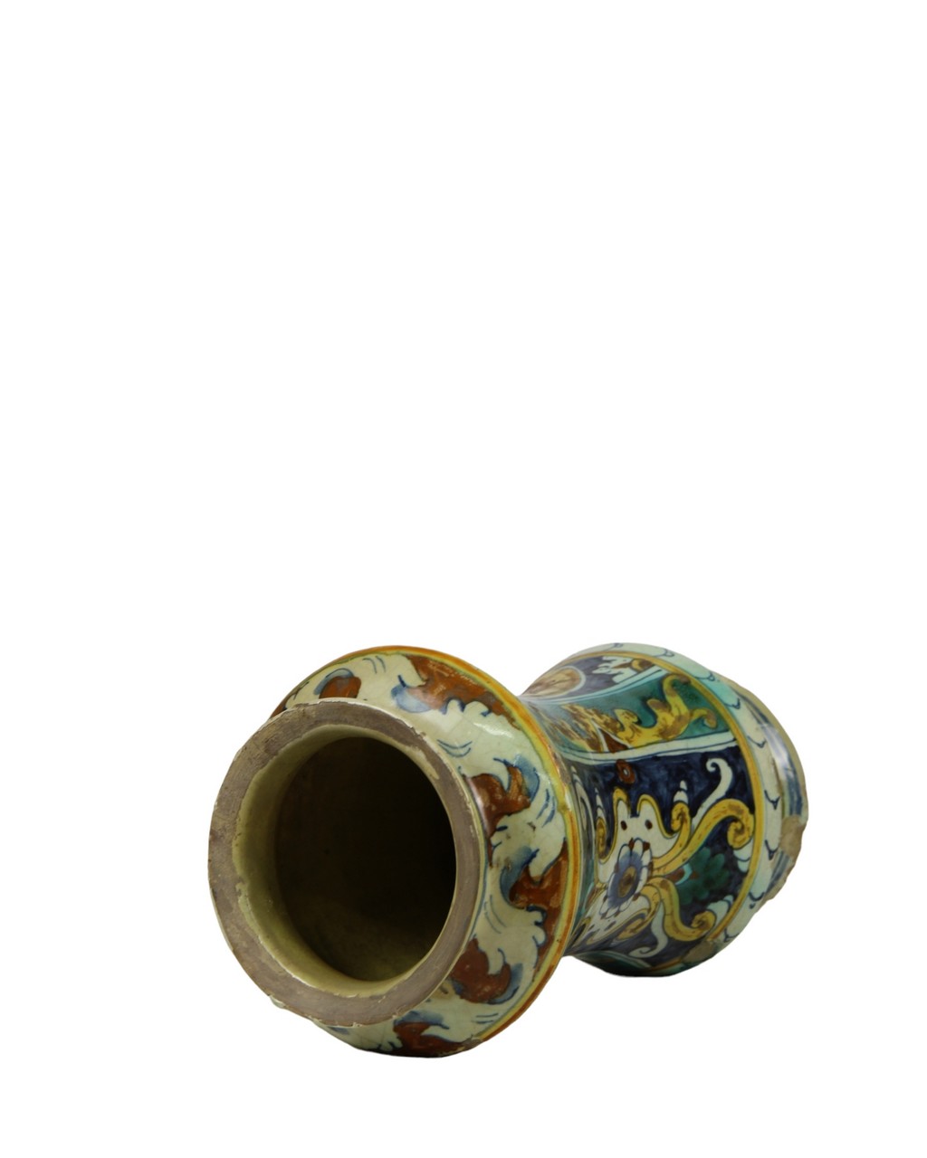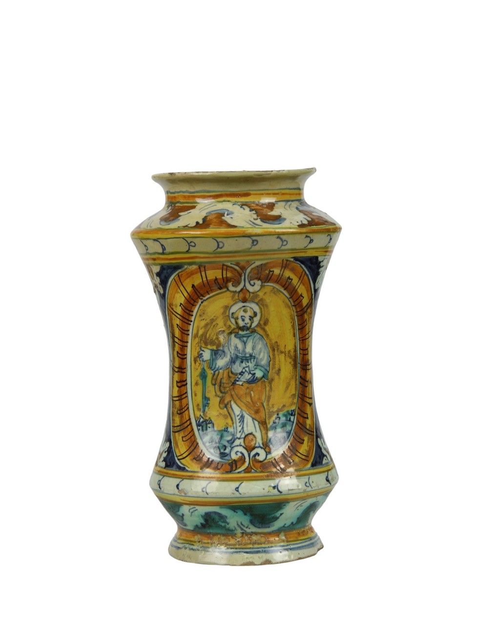 ALBARELLO in maiolica policroma fronte raffigura figura di Santo entro riserva , retro decorato da soggetti floreali. Sciacca bottega Lo Bue 1680 circa. h cm 25 x 14