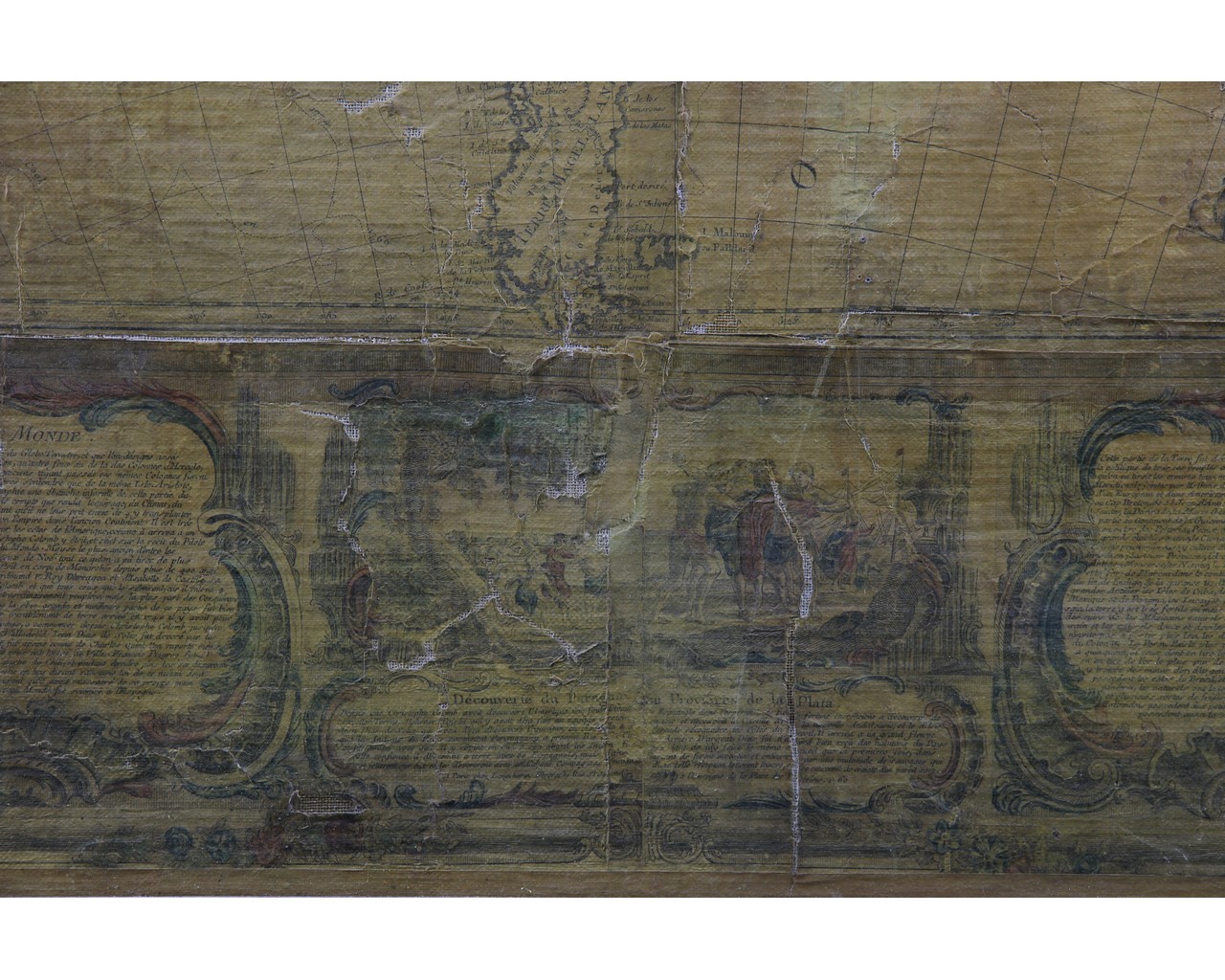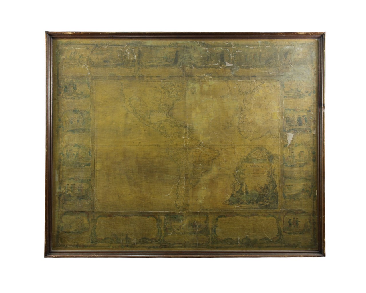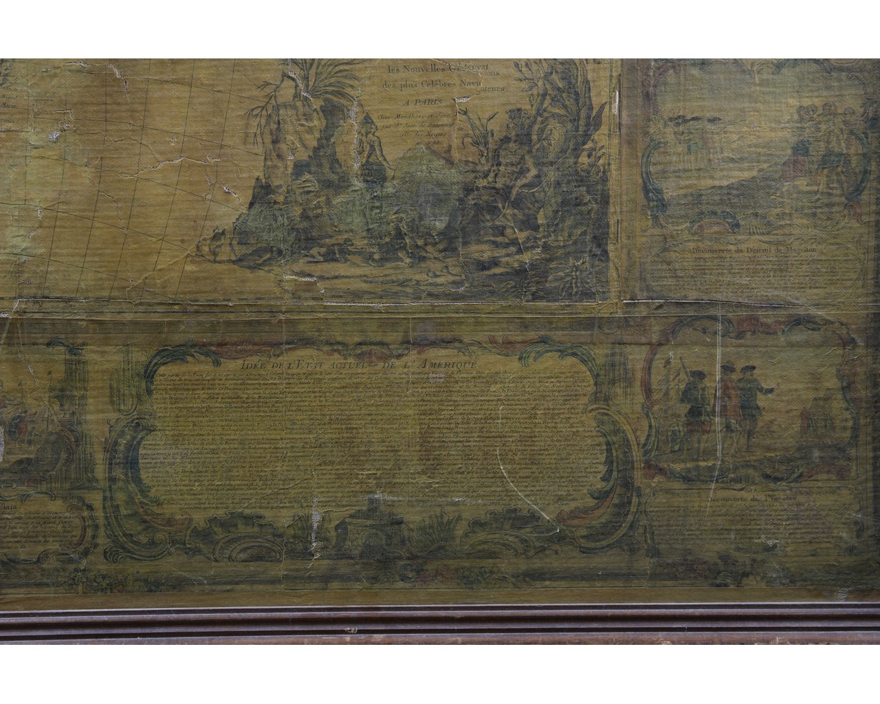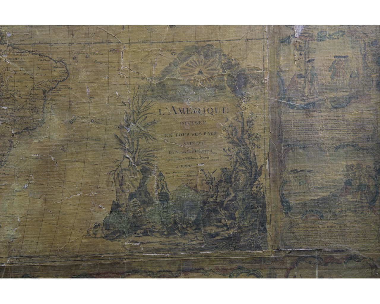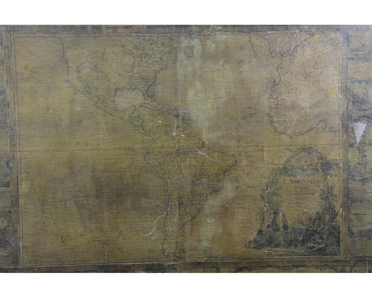IMPORTANTE CARTINA GEOGRAFICA SU CARTA APPLICATA SU TELA Raffigurante l'America e scene di vita, reca scritta Parigi 1788, già collezione Pietro Accorsi, mancanze e usure del tempo. h cm 120 x 150