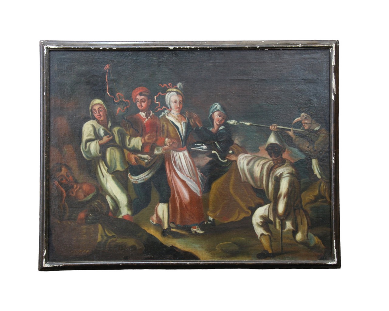 DIPINTO OLIO SU TELA Raffigurante Festa con ballo e maschere carnevalesche, scuola veneta XVIII secolo . h cm 75 x 100