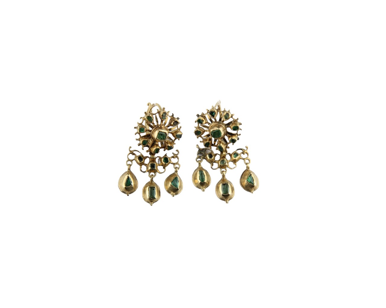COPPIA DI ORECCHINI in oro e radici di smeraldi, manifattura italiana , primi XX secolo