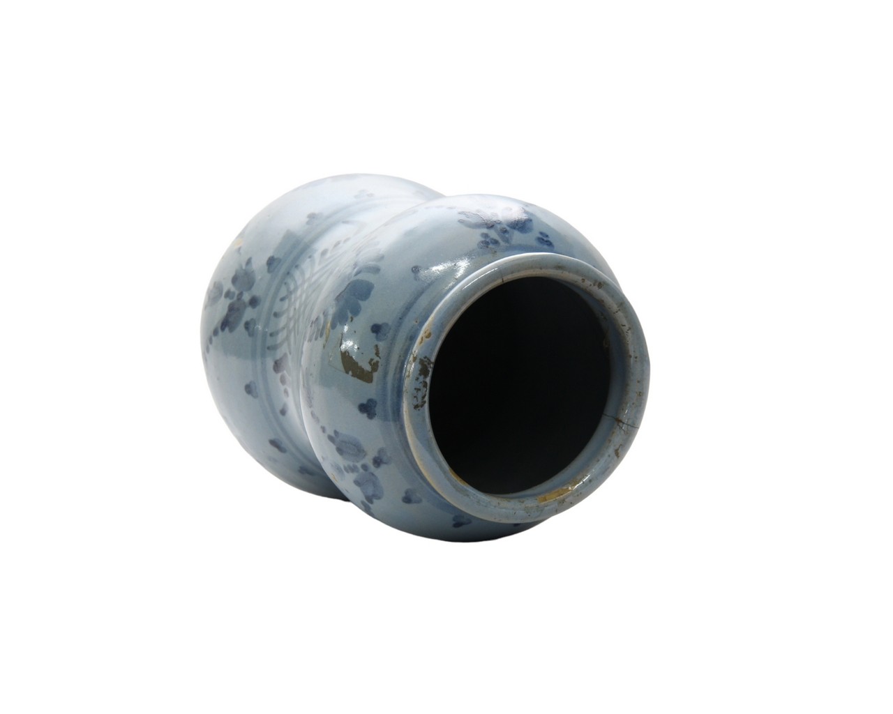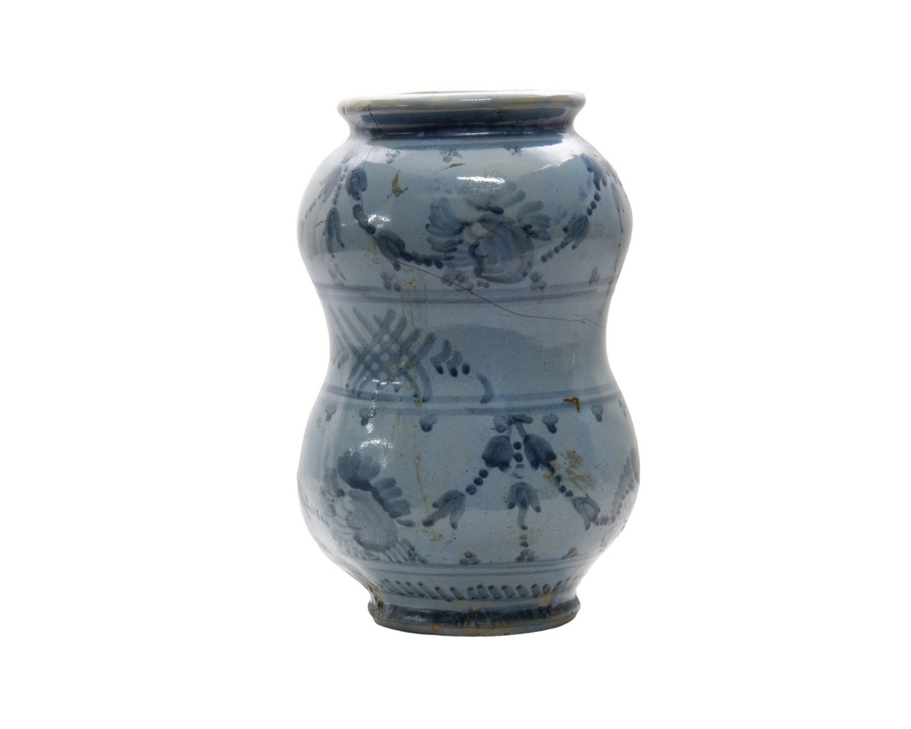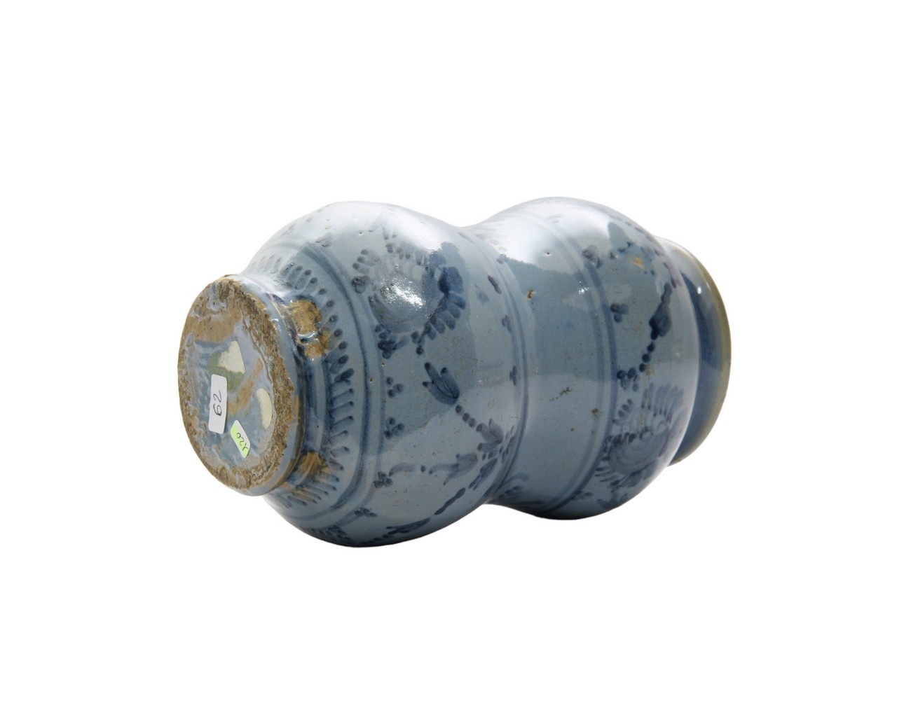 ALBARELLO DA FARMACIA in maiolica a fondo blu decori fogliacei . Liguria 1710 circa. h cm 20 x 12,5