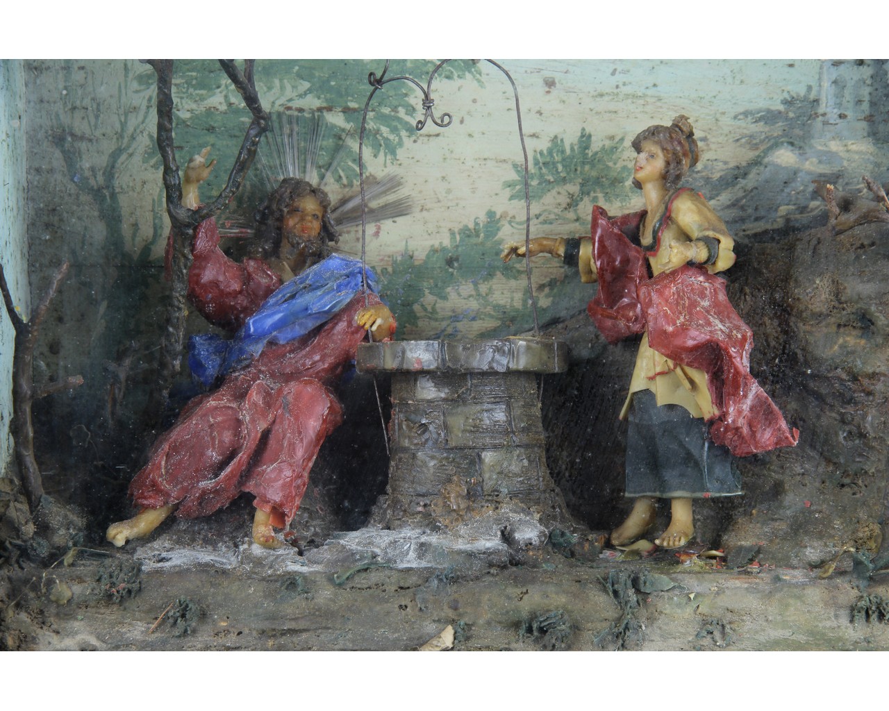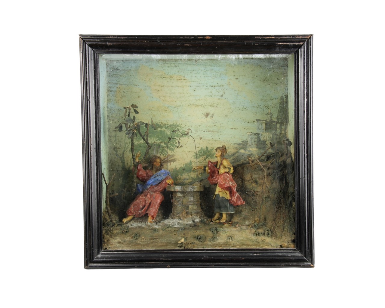 GRUPPO SCULTOREO in ceroplastica policroma Raffigurante Gesu' al pozzo e la samaritana dentro teca dipinta da paesaggio con cornice ebanizzata.. Sicilia 1680-1720. h cm 41 x 40 x 14,5