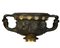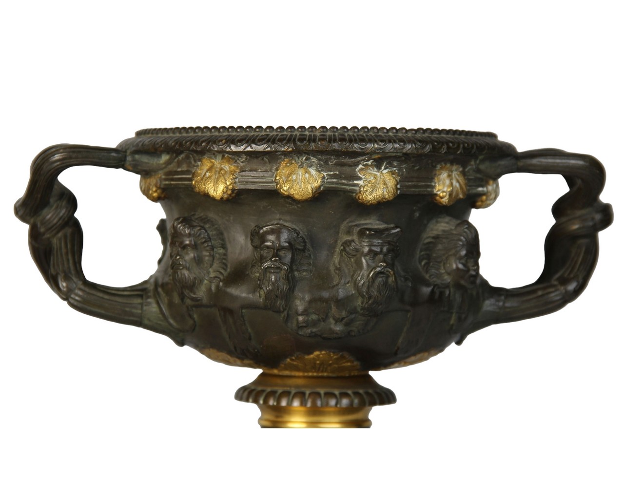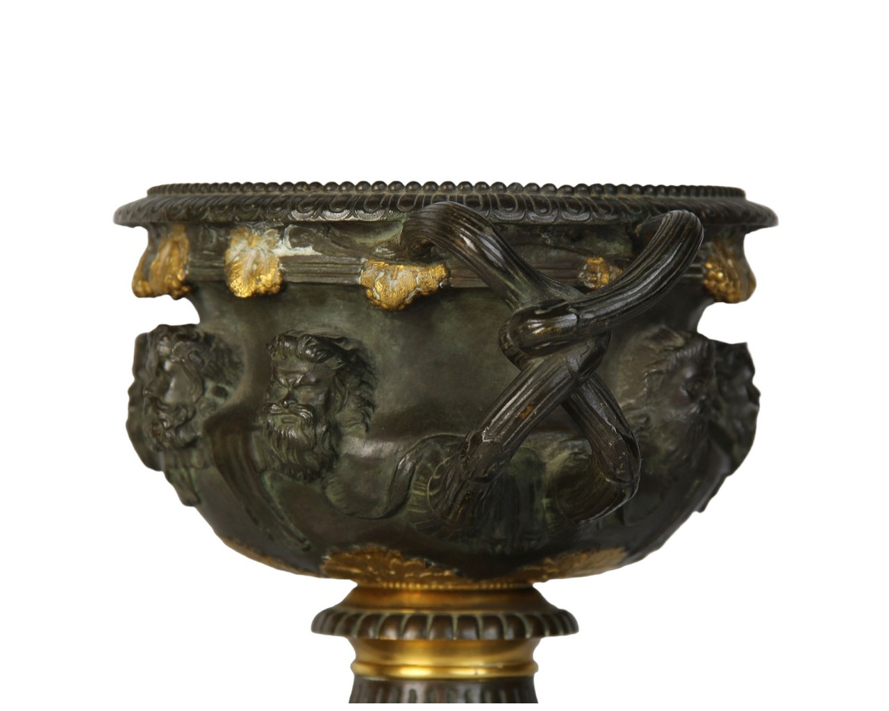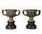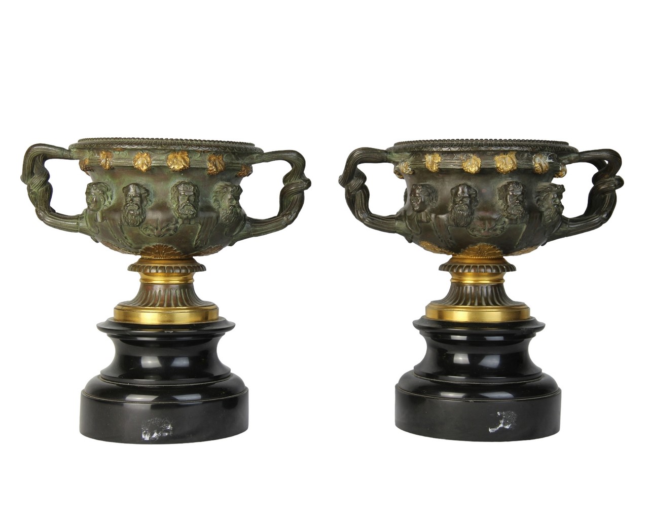 COPPIA DI ELEGANTI VASI A CRATERE in bronzo finemente cesellato brunito e dorato, base in marmo nero del Belgio . Francia XIX secolo . h cm 22 x 22