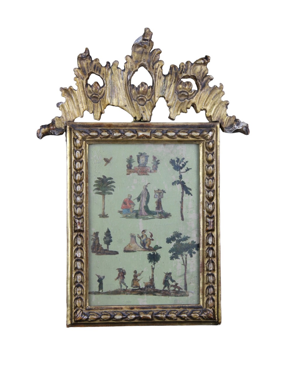 PANNELLO in legno laccato e decorato con applicazioni in arte povera , raffiguranti scene di vita dentro cornice in legno , riccamente intagliata e dorata ad oro zecchino. Piemonte XVIII secolo. h cm 42 x 30