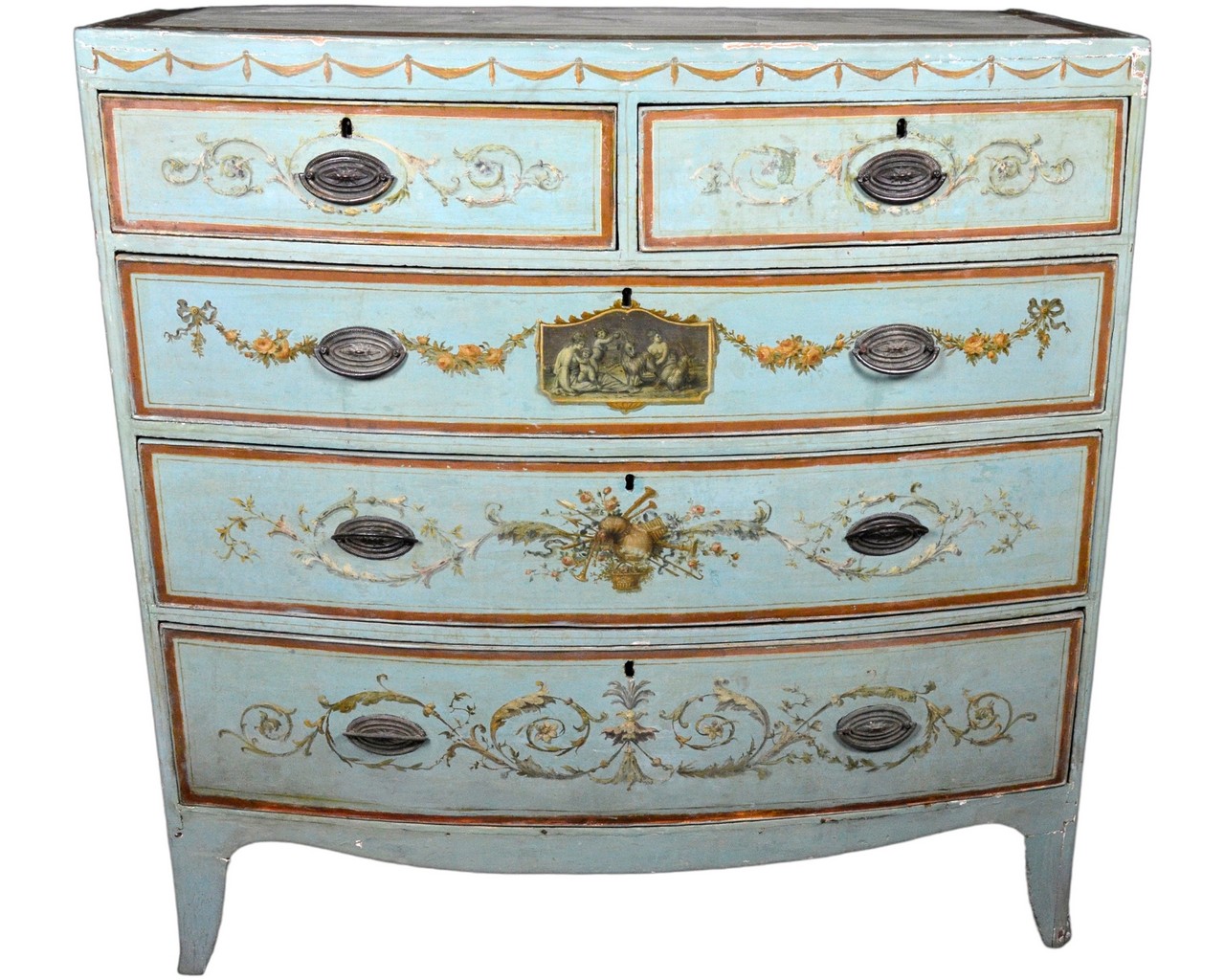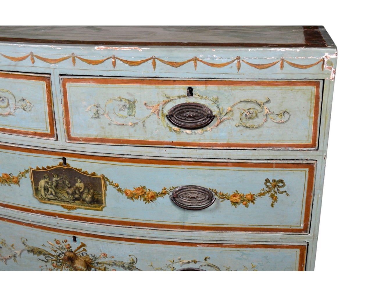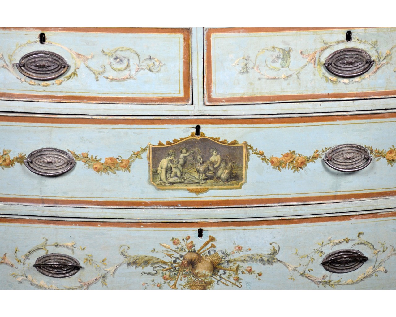 CASSETTONE in legno laccato, fondo celeste e dipinto a motivi floreali con medaglione centrale raffigurante personaggi ed animali. Inghilterra, 1780 /1830. h cm 104 x 101 x 46,5